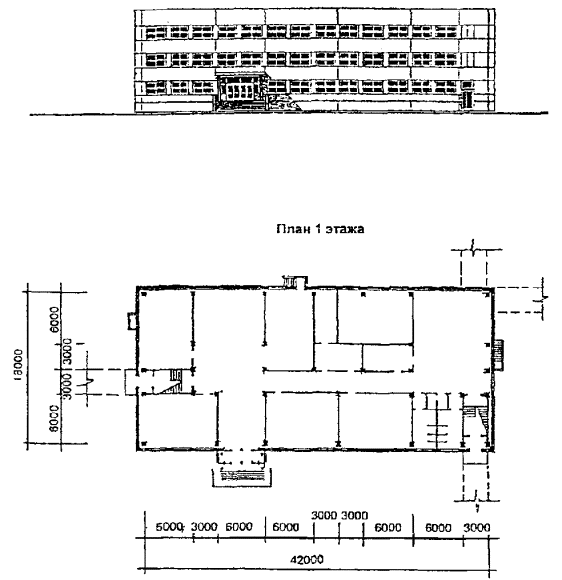 Рис. 5 Проект блока-пристройки на 12 начальных классов 360 учащихся V-81 (разработан в 1990 году). Фасад и план 1 этажа.