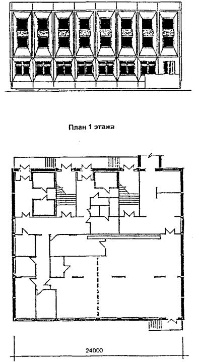 Рис. 7 Проект блока-пристройки столовой на 300 посадочных мест И-1783/2 (разработан в 1999 году). Фасад и план 1 этажа.