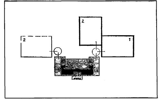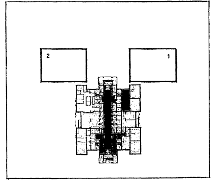 Рис. 12 Рекомендуемая функциональная схема примыкания блоков-пристроек к существующим зданиям школы типа V-76 1 - Блок учебных помещений; 2 - Блок общешкольных помещений