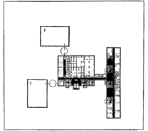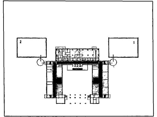 Рис. 11. Рекомендуемая функциональная схема примыкания блоков-пристроек к существующим зданиям школы типа 65-426/1 1 - Блок учебных помещений; 2 - Блок общешкольных помещений