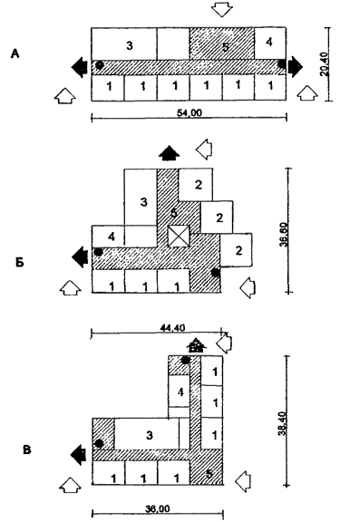Рис. 13 Рекомендуемая функциональная схема примыкания блоков-пристроек к существующим зданиям школы типа И-1605А 1 - Блок учебных помещений; 2 - Блок общешкольных помещений Рис. 14 Рекомендуемая функциональная схема примыкания блоков-пристроек к существующим зданиям школы типа И-1577А 1 - Блок учебных помещений; 2 - Блок общешкольных помещений Рис. 15 Варианты планировочных схем блоков-пристроек начальной школы на 8 или 12 классов А - прямоугольная (традиционная); Б - треугольная с квадратными классами и верхней подсветкой; В - угловая; 1 - класс - 9,0 ´ 7,2; 2 - класс - 8,4 ´ 8,4; 3 - спортзал - 30 ´ 18; 4 - универсальное помещение; 5 - рекреация зального типа.