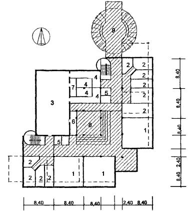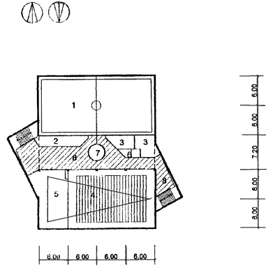 Рис. 29 Схема архитектурно-планировочного решения блока общешкольных помещений с залами «БОП-1» План 2 этажа: 1 - второй свет спортзала; 2 - кладовая инвентаря; 3 - раздевальная с душевой при зале; 4 - актовый зал; 5 - эстрада; 6 - бытовые помещения; 7 - второй свет холла-рекреации; 8 - рекреация
