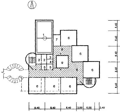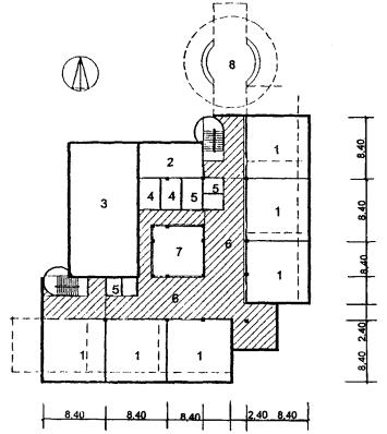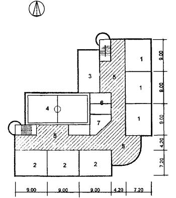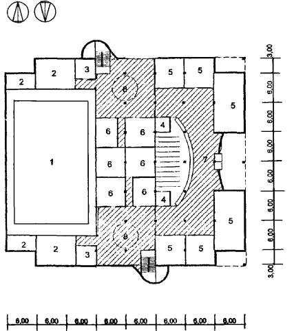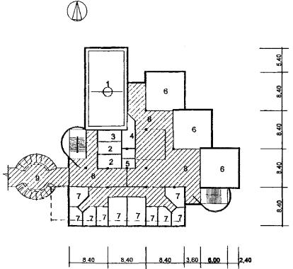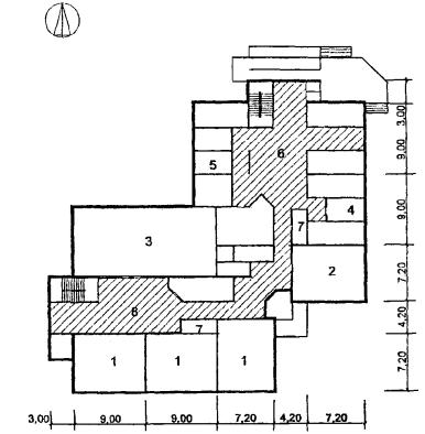 Рис. 35 Схема архитектурно-планировочного решения блока общешкольных помещений с залами, бассейном и кружковыми «БСКБ» План 1 этажа: 1 - бассейн; 2 - тренажерный зал; 3 - раздевальные; 4 - кружковые; 5 - вестибюль с гардеробом; 6 - санузлы; 7 - снарядная; 8 - служебные помещения