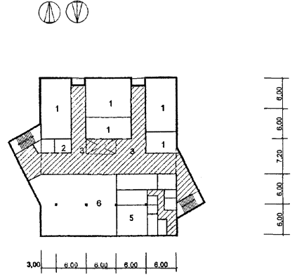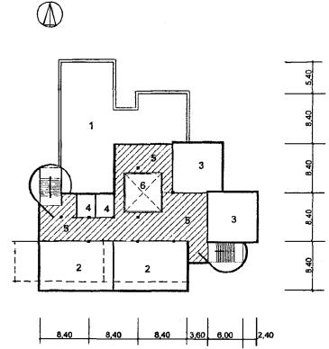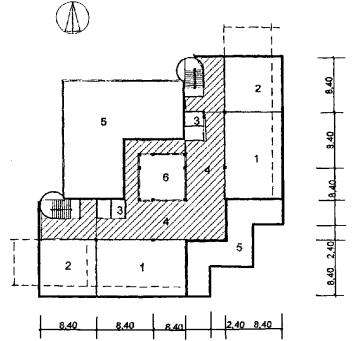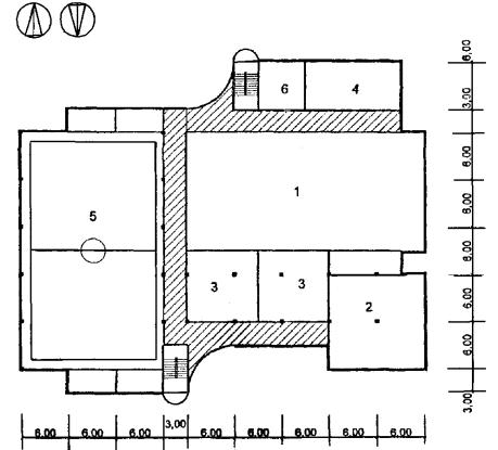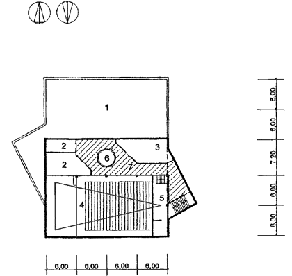 Рис. 33 Схема архитектурно-планировочного решения блока общешкольных помещений с залами и кружковыми «БОП-3» План 3 этажа: 1 - второй свет спортзала; 2 - кладовые; 3 - душевые с раздевальной; 4 - второй свет актового зала; 5 - киноаппаратная; 6 - фойе-рекреация; 6 - второй свет фойе-рекреации