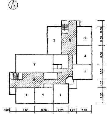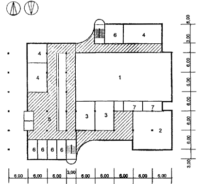 Рис. 28 Схема архитектурно-планировочного решения блока общешкольных помещений с залами «БОП-1» План 1 этажа: 1 - спортзал; 2 - снарядная; 3 - комната инструктора; 4 - раздевальная с душевой; 5 - бытовое помещение; 6 - обеденный зал столовой; 7 - помещения кухни