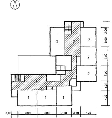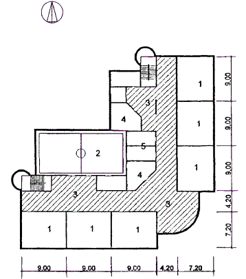 Рис. 26 Схема архитектурно-планировочного решения блока начальной школы на 12 классов(300 уч.) «БНШ-2» План 2 этажа: 1 - класс; 2 - спортзал; 3 - рекреация зального типа; 4 - раздевальные; 5 - санузел