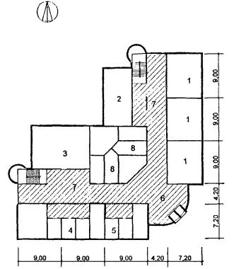 Рис. 22 Схема архитектурно-планировочного решения блока начальной школы на 8 классов (200 уч.). «БНШ-1» План 1 этажа: 1 - класс; 2 - спальная; 3 - спортзал; 4 - административные помещения; 5 - медблок; 6 - вестибюль с гардеробом; 7 - санузел; 8 - рекреации зального типа