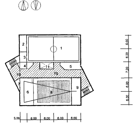 Рис. 32 Схема архитектурно-планировочного решения блока общешкольных помещений с залами и кружковыми «БОП-3» План 2 этажа: 1 - спортзал; 2 - кладовая инвентаря; 3 - комната тренера; 4 - санузлы; 5 - душевая с раздевальной; 6 - эстрада; 7 - кладовая; 8 - актовый зал на 30 мест; 9 - техцентр; 10 - рекреация зального типа; 11 - второй свет холла-рекреации.