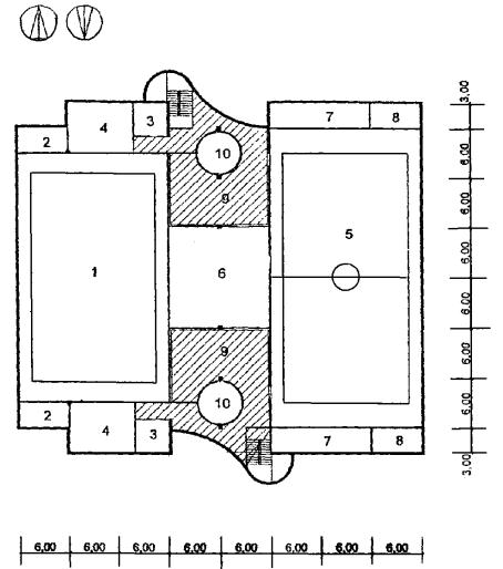 Рис. 36 Схема архитектурно-планировочного решения блока общешкольных помещений с залами, бассейном и кружковыми «БСКБ» План 2 этажа: 1 - второй свет бассейна; 2 - служебные помещения; 3 - комната тренера; 4 - тренажерный зал; 5 - спортзал; 6 - малый спортзал; 7 - снарядная; 8 - комната тренера; 9 - рекреация зального типа; 10 - второй свет холла-рекреации