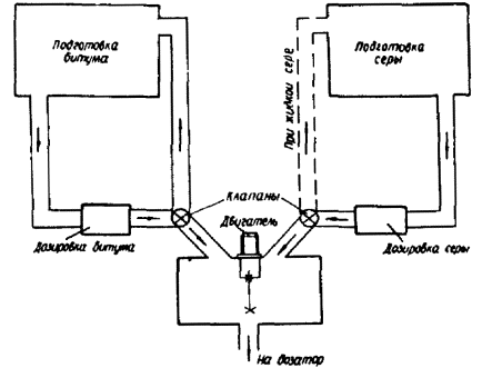 На 1 т смеси это составит: битума - 57 кг, серы - 25 кг. 3.8. После расчета состава асфальтобетона с добавкой серы следует приготовить контрольную смесь и определить весь комплекс показателей физико-химических свойств. Асфальтобетон с добавкой серы должен отвечать тем же требованиям, что и асфальтобетон с нефтяными битумами без добавки серы в соответствии с ГОСТ 9128-84. 4. Особенности технологии приготовления асфальтобетонных смесей с добавками серы4.1. Асфальтобетонные смеси с добавками серы следует приготавливать в соответствии с требованиями СНиП 3.06.03-85 «Организация, производство и приемка работ. Сооружения транспорта. Автомобильные дороги». 4.2. Добавку серы вводят в асфальтобетонную смесь двумя способами - либо в битум, либо непосредственно в смесь. 4.3. Для введения в битум можно использовать комовую или жидкую серу. Технологический процесс приготовления смесей при введении серы в битум включает приготовление СБВ и подачу его в смеситель через дозатор битума (см. рисунок). Серу, отдозированную по объему или массе, постепенно вводят в битумный котел, заполненный битумом не более чем на 0,75 его объема.