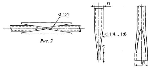 4.1.17. Детали стальных конструкций, торцы которых подлежат фрезерованию, должны иметь припуск от 5 до 6 мм на каждый фрезеруемый торец. 4.1.18. При отсутствии требований в чертежах, сборка должна обеспечивать точность линейных размеров готовой сборочной единицы по 16 квалитету: для размеров до 3150 мм - ГОСТ 25346; для размеров свыше 3150 мм - ГОСТ 25348. 4.1.19. Диаметры отверстий под болты в деталях стальных конструкций должны быть выполнены сверлением или продавливанием. Сверление или рассверливание монтажных отверстий должно производиться после полной сварки элементов, составляющих монтажные сборочные единицы. Рассверливание отверстий при общей сборке следует производить после окончания сборки, при этом должна быть обеспечена правильность геометрической формы отверстий и их расположение в пределах допуска. Допускается сверление и рассверливание монтажных отверстий до полной сварки монтажных узлов, если технологический процесс сварки и применяемая оснастка обеспечивают сохранение взаимного расположения монтажных отверстий. 4.1.20. Номинальные диаметры отверстий для болтов нормальной точности, включая и высокопрочные, должны соответствовать требованиям ГОСТ 11284. 4.2. Конструкции из труб4.2.1. Трубы не должны иметь кривизны, превышающей 1/1000 длины детали и 4 мм для труб диаметром до 200 мм, 6 мм для труб диаметром свыше 200 мм. 4.2.2. Правку термически упрочненных труб на прессах следует производить в холодном состоянии. Трубы горячекатаные или нормализованные допускается править с нагревом газопламенной горелкой по технологии предприятия-изготовителя машины, гарантирующей сохранение качества стали. 4.2.3. Обработка деталей из труб давлением (гибка, сплющивание, вальцовка концов, высадка и др.) должна исключать коробление, появление трещин и надрывов, а также исключать закалку. При гибке труб допускается овальность в местах гиба до 15 % наружного диаметра. 4.2.4. Сплющивание концов труб следует производить только в горячем состоянии. В виде исключения допускается холодное сплющивание углеродистых горячекатаных труб, если при этом отсутствуют излом, расслоение, надрывы, трещины, видимые вооруженным глазом. Нагрев труб при сплющивании должен производиться по технологии предприятия-изготовителя машины, гарантирующей сохранение качества стали. 4.2.5. Сплющивание следует проводить призматическими матрицами трапецеидального сечения с уклоном боковых граней около 1:4 ... 1:6 и радиусом сопряжения рабочих плоскостей не менее 5 мм в соответствии с рис. 2. 4.2.6. Снятие внутренних напряжений в электросварных трубах не требуется. Продольный сварной шов трубы должен располагаться в пределах средней трети ширины лопатки В. Длина лопатки h должна быть не меньше толщины стенки трубы в соответствии с рис. 3. Рис. 3 4.2.7. Обработка концов деталей из труб должна производиться газопламенной резкой, различными механическими способами, а также рубкой специальными штампами, с соблюдением требований п. 4.2.4. 4.2.8. После гибки труб в горячем состоянии их внутренняя поверхность должна быть очищена от наполнителя и пригара. 4.3. Сборка и подготовка к сварке4.3.1. Сборка стальных конструкций грузоподъемного оборудования под сварку должна производиться в кондукторах или на стендах, обеспечивающих необходимую точность сборки, в строгом соответствии с утвержденным технологическим п
