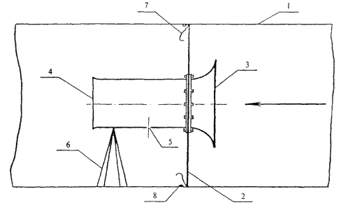 Данная формула с достаточной для практики точностью справедлива при значениях температуры воздуха в пределах 15 - 25 °С. 3.4.3 Определение мест утечек воздуха в отсеке. 3.4.3.1 При испытании отсека на герметичность в нем создается достаточно высокое давление (подпор), приближающееся к величине напора вентиляторов (~ 60 - 80 кгс/м2), вследствие чего происходит утечка воздуха через неплотности в ограждающих конструкциях и в защитных устройствах. 3.4.3.2 Для снижения утечек воздуха из отсека и соответственно повышения его герметичности в процессе испытаний необходимо обнаружить места утечек и устранить их. 1 - вентиляционный тоннель; 2 - перемычка; 3 - входной раструб; 4 - цилиндрическая часть; 5 - отверстие для установки измерительного прибора; 6 - штатив; 7 - крепежные устройства (тесемки, ремень); 8 - решетка Рисунок 2 - Схема установки перемычки с измерительным коллектором в вентиляционном тоннеле Наиболее вероятными местами утечек воздуха из отсека являются: - притворы защитных устройств; - заделка обрамления защитных устройств в упоры; - вводы коммуникаций в отсек (кабельные, водопроводные и др.); - дренажи, оборудованные задвижками. Не исключается утечка воздуха и через неплотности в ограждающих строительных конструкциях тоннелей. 3.4.3.3 Обнаружение неплотностей в отсеке возможно различными способами. Например, при давлении в отсеке более 30 кгс/м2 утечки могут быть обнаружены на слух. Особенно эффективен этот способ при обнаружении утечек в защитных устройствах. В этих же местах утечки могут быть обнаружены осязанием. Хорошим индикатором утечек является пламя свечи, которое при значительных утечках вблизи обнаруженных неплотностей отклоняется под действием воздушного потока. Для индикации утечек могут быть использованы различные дымообразующие устройства - от специальных «дымообразующих трубок», используемых в горном деле, до простейших дымарей. 3.4.3.4 Места утечек воздуха отмечаются мелом, фиксируются в схеме отсека и в карточках защитных устройств. 3.5 Работы по 3.4 повторяют при измененной воздухоподаче путем: - включения второго вентилятора УТВ; - включения второй (третьей) УТВ; - частичного перекрытия (например, защитным устройством, шибером и т.п.) сечения вентиляционного канала; - изменения частоты вращения колеса вентилятора. 3.6 При завершении испытаний по команде с КПИ отключаются УТВ наддува и восстанавливается исходное положение всех защитных устройств. Из отсека удаляются использованные в испытаниях оборудование и материалы. 4 Оформление результатов испытаний На основании результатов замеров и расчетов, выполненных по данной методике, составляется протокол испытаний отсека на герметичность. К протоколу прикладываются: схема испытываемого отсека, журналы наблюдений, карточки защитных устройств и, при необходимости, пояснительная записка. 5 Примерные формы основных отчетных (рабочих) документов Использованные в приведенных ниже формах документов наименования устройств, приборов, оборудования, места их установки в отсеке, а также схема отсека с условными обозначениями и график работы УТВ даны в качестве примера. При проведении испытаний в отсеке в соответствии с настоящей методикой подготавливается его схема, а формы заполняются согласно фактическому наименованию и наличию задействованных при этом устройств, оборудования 