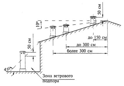 Рисунок 1 - Варианты выбора высоты дымохода над кровлей здания в зависимости от его расположения 7 Электроснабжение и автоматизация7.1 Для электроснабжения систем автоматики и управления работой теплогенератора должны быть предусмотрены: подвод электропитания напряжением 220 В от однофазной сети с заземлением; установка розетки электропитания теплогенератора, оснащенной нулевым защитным проводником и подключенной на вводе к автоматическому выключателю. Сечение проводов следует выбирать в соответствии с ПУЭ, указаниями в паспорте на котел или инструкцией по монтажу и наладке фирмы-изготовителя теплогенератора. 7.2 Напольные теплогенераторы, используемые для помещений общественного назначения, могут оснащаться встроенными токопреобразующими устройствами и самостоятельным контуром заземления с клеммой, подсоединяемой к контуру заземления здания. 7.3 Установку устройств защитного отключения следует выполнять в соответствии с ПУЭ, НПБ 243 и СП 31-110. 7.4 В помещениях, где устанавливаются теплогенераторы, следует предусматривать установку сигнализаторов загазованности, срабатывающих при достижении загазованности помещения 10 % нижнего концентрационного предела распространения пламени (НКПРП) природного газа. Сигнализатор загазованности должен быть сблокирован с быстродействующим электромагнитным клапаном, устанавливаемым на вводе газа в помещение и отключающим подачу газа по сигналу загазованности. 7.5 Теплогенератор должен быть оснащен устройством, обеспечивающим автоматическое поддержание температуры воздуха в жилых помещениях на постоянном, регулируемом пользователем уровне. 7.6 В каждой квартире в представительном жилом помещении рекомендуется предусмотреть установку регулятора температуры воздуха, оснащенного датчиком температуры воздуха в помещении, обеспечивающего автоматическое поддержание заданной температуры блоком управления работой теплогенератора. 7.7 В теплогенераторных помещений общественного назначения рекомендуется предусматривать размещение автоматических пожарных извещателей согласно НПБ 88 и установку автономного пожарного извещателя при размещении теплогенератора в кухне. 7.8 На подводе газа к котлу, устанавливаемому в теплогенераторной для помещений общественного назначения, следует предусматривать установку термочувствительных клапанов. 7.9 Для контроля за работой теплогенераторов необходимо организовать диспетчерскую службу. На диспетчерский пункт должны передаваться сигналы (световые и звуковые): нормальной работы котла; аварийного останова котла; загазованности помещения; возникновения пожара (при размещении теплогенератора в теплогенераторной); несанкционированного проникновения посторонних людей в помещение теплогенераторной. 7.10 Вентиляторы, запорно-регулирующая арматура систем вентиляции, а также конструкция, исполнение, способ установки, класс изоляции электроустановок помещений с теплогенераторами должны соответствовать условиям окружающей среды и требованиям соответствующих глав ПУЭ. 8 Отопление, вентиляция, водопровод и канализация8.1 Отопление и вентиляция8.1.1 При поквартирном теплоснабжении системы отопления и вентиляции следует проектировать согласно СНиП 41-01 и настоящему документу. 8.1.2 Отопление должно обеспечивать температуру воздуха в жилы