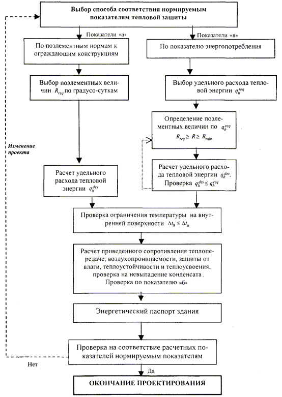 Рисунок 1 - Схема проектирования тепловой защиты зданий Если расчетное значение qhreq меньше нормируемого значения qhreq, то осуществляют перебор следующих вариантов с тем, чтобы расчетное значение не превышало нормируемое: - понижением по сравнению с нормируемыми значениями уровня теплозащиты для отдельных ограждений здания, в первую очередь для стен; - изменением объемно-планировочного решения здания (размеров, формы и компоновки из секций); - выбором более эффективных систем теплоснабжения, отопления и вентиляции и способов их регулирования; - комбинированием предыдущих вариантов. В результате перебора вариантов определяют новые значения нормируемых сопротивлений теплопередаче Rreq ограждающих конструкций (наружных стен, покрытий, чердачных и цокольных перекрытий, окон, витражей и фонарей, наружных дверей и ворот), которые могут отличаться от выбранных в качестве первого приближения как в меньшую, так и в большую сторону. Это значение не должно быть ниже минимальных величин, указанных в 5.13 СНиП 23-02. Проверяют на допустимую величину расчетного температурного перепада Δtп. 6.9 Рассчитывают теплоэнергетические параметры согласно разделу 7 и заполняют энергетический паспорт согласно разделу 18 настоящего Свода правил. 7 ТЕПЛОЭНЕРГЕТИЧЕСКИЕ ПАРАМЕТРЫ7.1 Теплоэнергетические параметры следует определять независимо от выбора групп показателей «а» или «в» (6.2). 7.2 Основными параметрами, характеризующими расход тепловой энергии здания на нужды отопления, являются приведенный коэффициент теплопередачи через наружные ограждения здания Кmtr, Вт/(м2×°С), и условный коэффициент теплопередачи Кminf, Вт/(м2×°С), учитывающий теплопотери за счет инфильтрации и вентиляции. Приведенный коэффициент теплопередачи здания формируется теплозащитными свойствами всех элементов оболочки здания, включая все виды теплотехнических неоднородностей, создаваемых при проектировании ограждающих конструкций и формировании объемно-планировочного решения здания. Необходимый воздухообмен в здании обеспечивается степенью герметичности ограждающих конструкций здания, приточными отверстиями в ограждающих конструкциях здания, системой вытяжных устройств и предусмотренными в необходимых случаях системами механической вентиляции. 7.3 При определении qhreq и учете вида системы теплоснабжения, к которой подключено здание, определяют коэффициент энергетической эффективности ε систем отопления и теплоснабжения согласно 5.12 СНиП 23-02 и 7.4 настоящего Свода правил. 7.4 Расчетный коэффициент энергетической эффективности систем отопления и централизованного теплоснабжения здания eodes определяется по формуле eоdes = (c1e1)(c2e2)(c3e3)(c4e4), (4) где c1 - расчетный коэффициент теплопотерь в системах отопления здания; e1 - расчетный коэффициент эффективности регулирования в системах отопления здания; c2 - расчетный коэффициент теплопотерь распределительных сетей и оборудования тепловых (центральных и индивидуальных) и распределительных пунктов; e2 - расчетный коэффициент эффективности регулирования оборудования тепловых (центральных и индивидуальных) и распределительных пунктов; c3 - расчетный коэффициент теплопотерь магистральных тепловых сетей и оборудования системы теплоснабжения от источника теплоснабжения до теплового или распределительного пункта; e3 - расчетный коэффиц