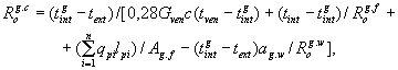 Для утепленных полов на грунте в случае, когда материалы пола и стены имеют расчетные коэффициенты теплопроводности l < 1,2 Вт/(м×°С), приведенное сопротивление теплопередаче Ros определяют по нормативной документации. 9.3.4 Нормируемое сопротивление теплопередаче цокольного перекрытия над техподпольем Rob.с, м2 °С/Вт, определяют по формуле Rob.с = n×Rreq, (39) где Rreq - нормируемое сопротивление теплопередаче перекрытий над техподпольем, определяемое согласно СНиП 23-02 в зависимости от градусо-суток отопительного периода климатического района строительства; n - коэффициент, определяемый по формуле n = (tint - tintb)/(tint - text), (40) tjnt, text - то же, что и в 9.2.1; tint - то же что и в 9.3.2. 9.3.5 Температуру воздуха в техподполье tintb, °С, определяют по формуле где tint - расчетная температура воздуха в помещении над техподпольем, °С; text, qpi, lpi, c - то же что и в формуле (32); Аb - площадь техподполья (цокольного перекрытия), м2; Rob.с - нормируемое сопротивление теплопередаче цокольного перекрытия, м2×°С/Вт, устанавливаемое согласно 9.3.4; Vb - объем воздуха, заполняющего пространство техподполья, м3; па - кратность воздухообмена в подвале, ч-1: при прокладке в подвале газовых труб па = 1,0 ч-1, в остальных случаях па = 0,5 ч-1; r - плотность воздуха в техподполье, кг/м3, принимаемая равной r = 1,2 кг/м3; Аs - площадь пола и стен техподполья, контактирующих с грунтом, м2; Ror.s - то же что и в 9.3.3; Ab.w - площадь наружных стен техподполья над уровнем земли, м2; Rob.w - то же, что и в 9.3.2. Если tintb отличается от первоначально заданной температуры, расчет повторяют по 9.3.3 - 9.3.5 до получения равенства величин в предыдущем и последующем шагах. 9.3.6 Проверяют по формуле (4) СНиП 23-02 полученное расчетом нормируемое сопротивление теплопередаче цокольного перекрытия на удовлетворение требования по нормируемому температурному перепаду для пола первого этажа, равному Dtn = 2 °С. 9.3.7 Пример расчета приведен в приложении Т. 9.4 СВЕТОПРОЗРАЧНЫЕ ОГРАЖДАЮЩИЕ КОНСТРУКЦИИ Светопрозрачные ограждающие конструкции подбирают по следующей методике. 9.4.1 Нормируемое сопротивление теплопередаче Rreq светопрозрачных конструкций следует определять по таблице 4 СНиП 23-02. При этом сначала вычисляют для соответствующего климатического района количество градусо-суток отопительного периода Dd по формуле (1) настоящего Свода правил. В зависимости от величины Dd и типа проектируемого здания по колонкам 6 и 7 вышеупомянутой таблицы определяется значение Rreq. Для промежуточных значений Dd величина Rreq определяется по формулам примечания 1 к этой таблице. 9.4.2 Выбор светопрозрачной конструкции осуществляется по значению приведенного сопротивления теплопередаче Ror, полученному в результате сертификационных испытаний. Если ее приведенное сопротивление теплопередаче выбранной светопрозрачной конструкции Rоr, больше или равно Rreq, то эта конструкция удовлетворяет требованиям норм. 9.4.3 При отсутствии сертифицированное данных допускается использовать при проектировании значения Ror, приведенные в приложении Л настоящего Свода правил. Значения Ror в этом приложении даны для случаев, когда отношение площади остекления к площади заполнения светового проема b равно 0,75. При использовании светопрозрачных конструкций с другими значениями b следует корректировать значение Ror следующим образом: для конструкций с деревянными или пластмассовыми переплетами при каждом увел