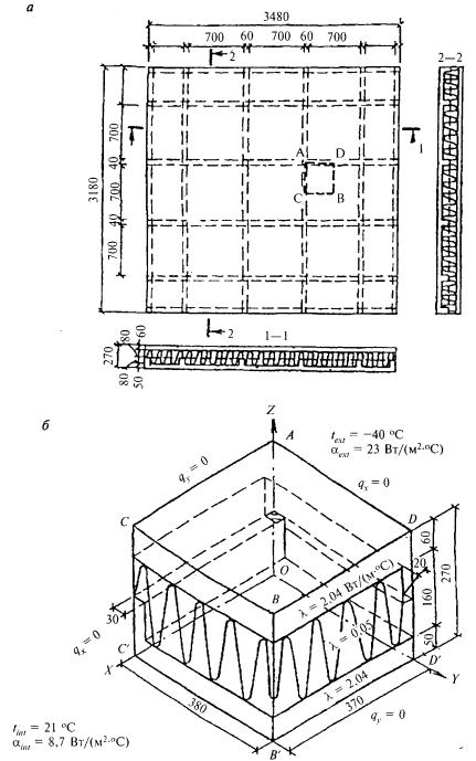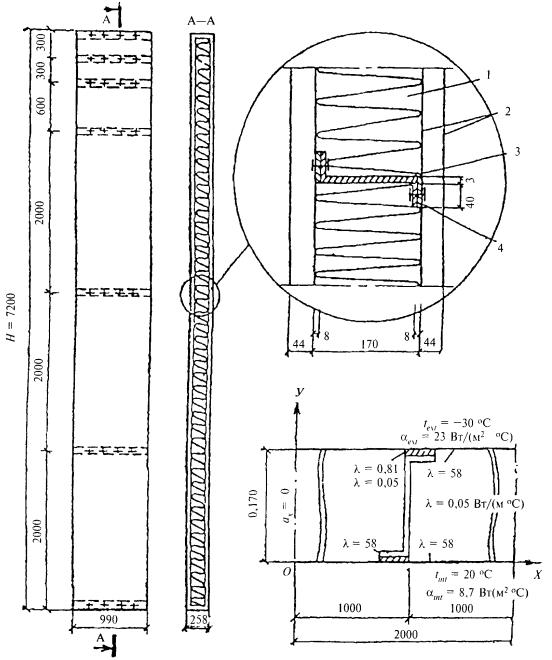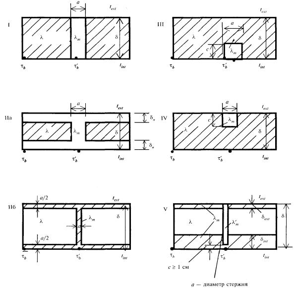 9.1.3 Теплотехнический расчет неоднородных наружных ограждающих конструкций, содержащих углы, проемы, соединительные элементы между наружными облицовочными слоями (ребра, шпонки, стержневые связи), сквозные и несквозные теплопроводные включения, выполняют на основе расчета температурных полей по приложению М. Приведенное сопротивление теплопередаче Ror, м2×°С/Вт, неоднородной ограждающей конструкции или ее участка (фрагмента) следует определять по формуле Ror = n(tint - text)A/Q, (9) где А - площадь неоднородной ограждающей конструкции или ее фрагмента, м2, по размерам с внутренней стороны, включая откосы оконных проемов; Q - суммарный тепловой поток через конструкцию или ее фрагмент площадью А, Вт, определяемый на основе расчета температурного поля на ЭВМ либо экспериментально по ГОСТ 26254 или ГОСТ 26602.1 с внутренней стороны; п - коэффициент, принимаемый в зависимости от положения наружной поверхности ограждающих конструкций по отношению к наружному воздуху, принимаемый согласно таблице 6 СНиП 23-02 с учетом примечания к этой таблице; tint - расчетная температура внутреннего воздуха, °С, принимаемая согласно указаниям 5.2 настоящего Свода правил; text - расчетная температура наружного воздуха, °С, принимаемая согласно указаниям 5.1 настоящего Свода правил. Методика и примеры определения приведенного сопротивления теплопередаче ограждающих конструкций на основе расчета температурных полей на компьютере приведены в приложении М. Приведенное сопротивление теплопередаче Rоr всей ограждающей конструкции следует осуществлять по формуле где Аi, Ro,ir - соответственно площадь i-го участка характерной части ограждающей конструкции, м2, и его приведенное сопротивление теплопередаче, м2×°С/Вт; А - общая площадь конструкции, равная сумме площадей отдельных участков, м2; т - число участков ограждающей конструкции с различным приведенным сопротивлением теплопередаче. 9.1.4 Допускается приведенное сопротивление характерного i-го участка ограждающей конструкции Ror определять одним из следующих методов: а) по формуле Ror = Roconr, (11) где Rocon - сопротивление теплопередаче i-го участка однородной ограждающей конструкции, определяемое по формулам (8) и (9), м2×°С/Вт; r - коэффициент теплотехнической однородности i-го участка ограждающей конструкции, учитывающий влияние стыков, откосов проемов, обрамляющих ребер, гибких связей и других теплопроводных включений, определяемый по 9.1.5, 9.1.6; б) по формуле (8), где Rk следует заменить на приведенное термическое сопротивление участка Rkr, рассчитываемое по 9.1.7 либо 9.1.8; в) согласно 9.1.3 для участков конструкций, не приведенных в 9.1.5 - 9.1.8. 9.1.5 Для плоских неоднородных ограждающих конструкций, содержащих приведенные в приложении Н теплопроводные включения, коэффициент теплотехнической однородности r допускается определять по формуле где А - то же, что и в формуле (10); т - число теплопроводных включений конструкции; ai, Li - соответственно ширина и длина i-го теплопроводного включения, м; ki - коэффициент, зависящий от типа i-го теплопроводного включения, принимаемый для неметаллических теплопроводных включений по таблице Н.1 приложения Н, для металлических теплопроводных включений по формуле ki = 1 + Yidi2/(liaiRo,icon), (13) где Yi - коэффициент, зависящий от типа теплопроводного включения, принимаемый по таблице Н.2 приложения Н; di, li - толщина, м, и коэффициент те
