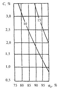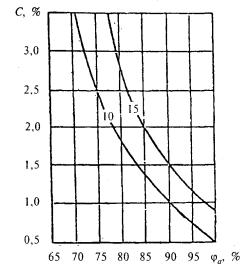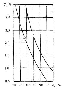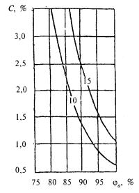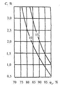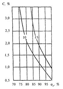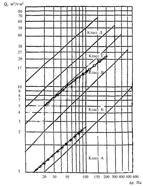 Рисунок 3 - График для подбора теплоаккумулирующих приборов (продолжительность зарядки 8 + 2 ч дневной подразрядки) Рисунок 4 - График для подбора теплоаккумулирующих приборов (продолжительность зарядки 6 + 2 ч дневной подразрядки) Показатель теплоусвоения внутренних поверхностей помещения и теплоаккумуляционных слоев прибора Yn и показатель интенсивности конвективного теплообмена в помещении L определяются соответственно по формулам: Yn = SAiYi; (61) L = SaskiAi, (62) где Yi - коэффициент теплоусвоения i-й поверхности помещения, определяемый согласно 12.2.3, и теплоаккумулирующего прибора, Вт/(м2×°С), определяемый по формуле Y = [R1s12 + R2s22(R2R1s12 + 2)]/[1 + R2s22(R2+2R1)], (63) R1, R2 - термические сопротивления соответственно теплоизоляционного и теплоаккумулирующего слоев прибора, м2×°С/Вт; s1, s2 - коэффициенты теплоусвоения материалов соответственно теплоизоляционного и теплоаккумулирующего слоев прибора, Вт/(м2×°С), принимаемые по приложению Д или по результатам теплотехнических испытаний; aski - коэффициент конвективного теплообмена i-й поверхности помещения и теплоаккумулирующего прибора с воздухом помещения, Вт/(м2×°С), принимаемый равным для: наружного ограждения - 3,1; внутреннего ограждения - 1,2; окна - 4,1; пола - 1,5; потолка - 3,5; теплоаккумулирующего прибора - 5,6 при температуре его поверхности 95 °С и 3,3 - при 40 °С; Аi - площадь i-й поверхности помещения и теплоаккумулирующего прибора, м2. 11.2.2.6 Мощность нагревательных элементов теплоаккумулирующего прибора Qp.c внепикового электроотопления определяется по формуле Qp.c = Qh.ldes(24/m), (64) где Qh.ldes - расчетные теплопотери помещения, Вт, определяемые по СНиП 41-01; т - продолжительность зарядки теплоаккумулирующего прибора, ч. 11.2.2.7 В случае когда электротеплоаккумуляционная система отопления частично покрывает теплопотери здания и является базовой частью комбинированной системы отопления, установочную мощность дополнительных постоянно работающих приборов системы отопления Qb следует определять по формуле Qb = Qh.ldes - Qcdes, (65) где Qh.ldes - то же, что и в 11.2.2.6; Qcdes - расчетные теплопотери помещения, Вт, при температуре наиболее холодной пятидневки на 5 °С выше указанной в СНиП 23-01. 11.2.2.8 Расчетную разность температур следует определять по формуле Dtdes = tintdes - textdes, (66) где tintdes, textdes - расчетные температуры соответственно внутреннего и наружного воздуха, те же, что и в формуле (9). 11.3 Пример определения мощности теплоаккумуляционного прибора приведен в приложении X. 12 ВОЗДУХОПРОНИЦАЕМОСТЬ ОГРАЖДАЮЩИХ КОНСТРУКЦИЙ И ПОМЕЩЕНИЙ ЗДАНИЙ12.1 Воздухоизоляционные свойства строительных материалов и конструкций характеризуются сопротивлением их воздухопроницанию Rinfdes, м2×ч×Па/кг, которое должно быть не менее нормируемого сопротивления воздухопроницанию Rinfdes, определяемого согласно разделу 8 СНиП 23-02. Сопротивление воздухопроницанию многослойной ограждающей конструкции Rinfdes, м2×ч×Па/кг, следует определять по формуле Rinfdes = Rinf 1 + Rinf 2 + ... + Rinf n, (67) где Rinf 1, Rinf 2, ... , Rinf n - сопротивления воздухопроницанию отдельных слоев ограждающей конструкции, м2×ч×Па/кг, принимаемые по таблице 17. Сопротивление воздухопроницанию заполнений светопроемов следует определять согласно 12.3, 12.4 и сравнивать со значениями, полученными в результате сертификационных испытаний. Таблица 17 - Сопротивление воздухопроницанию материалов и конструкций