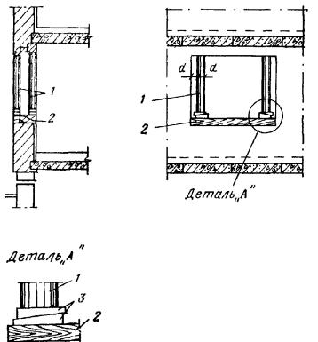 ПРИЛОЖЕНИЕ 5СПОСОБЫ ВРЕМЕННОГО УСИЛЕНИЯ КОНСТРУКЦИЙа) Усиление каменных простенков временными деревянными креплениями производится при помощи укладки на подоконные участки проемов парных горизонтальных разгрузочных брусьев, на которые (около простенков) устанавливаются деревянные стойки (по две с каждой стороны простенка), плотно поджимаемые клиньями и железобетонными элементами перемычек (рис. 1). Разгрузочные брусья принимаются по длине равными ширине проемов, а стойки - равными высоте проемов за вычетом толщины разгрузочных брусьев и клиньев. Ширина разгрузочных брусьев должна быть не менее диаметра стоек. Величина дополнительной нагрузки, передающейся на стойки усиления, определяется по формуле Nдоп = kFсмRсм, (1) где Nдоп - дополнительная нагрузка, воспринимаемая стойками усиления, кгс; k - коэффициент совместности работы деревянных стоек и кладки оттаивающего простенка, принимаемый k = 0,6; Fсм - площадь поперечного сечения стоек в месте опирания их на клинья, см2; Rсм - расчетный предел прочности деревянных клиньев на смятие поперек волокон, кгс/см2. Рис. 1. Усиление простенков временными деревянными стойками 1 - стойки диаметром 16 - 20 см; 2 - разгрузочные брусья толщиной 5 - 10 см; 3 - деревянные клинья