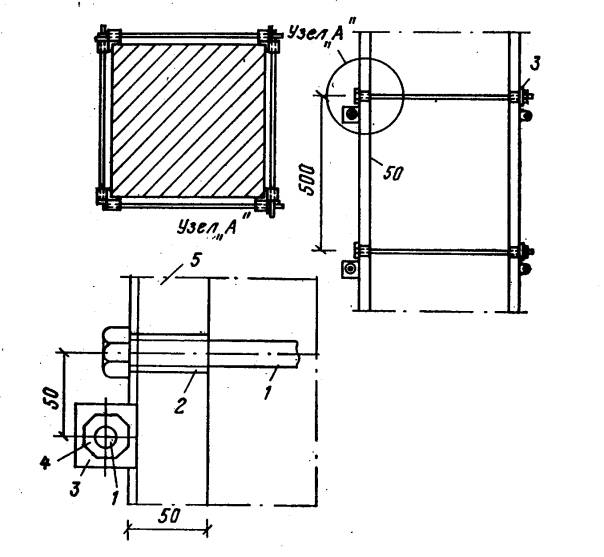 Рис. 2. Усиление простенков временными инвентарными обоймами 1 - болт; 2 - обрезок трубы; 3 - шайба; 4 - гайка М-16; 5 - уголок размером 50 ´ 50 мм б) Усиление каменных простенков и столбов временными (инвентарными) обоймами, представляющими собой сборные болтовые хомуты, стягивающие вертикальные уголки, производится на месте с установкой хомутов на расстоянии 500 мм по высоте простенка (рис. 2). Уголки должны быть сечением не менее 50 ´ 50 ´ 5 мм, а стягивающие их болты - диаметром не менее 16 мм. Для прикрепления болтов к стенкам уголков привариваются отрезки труб диаметром 20 - 25 мм, через которые пропускаются концы болтов с концевой нарезкой. Расчет несущей способности простенка из оттаивающей кладки, усиленного инвентарными обоймами (в кгс), производится по формуле