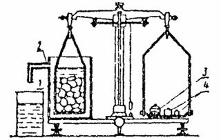 где m - навеска порошка, высушенного до постоянной массы, г; m1 - масса пикнометра с дистиллированной водой, г; m2 - масса пикнометра с навеской и дистиллированной водой после удаления пузырьков воздуха, г; rв - плотность воды, равная 1 г/см3. Расхождение между результатами двух определений не должно быть более 0,02 г/см3. Определение средней плотности зерен щебня (гравия) Для проведения испытания необходимы весы настольные гирные или циферблатные, весы технические с приспособлением для гидростатического взвешивания (рис. 2), сосуд для насыщения щебня (гравия) водой и набор стандартных сит. Для определения средней плотности зерен щебня (гравия) крупностью до 40 мм берут пробу массой около 2,5 кг. При испытании щебня (гравия) фракции крупные 40 мм берут пробу массой около 5 кг зерна крупнее 40 мм дробят до получения частиц размером не более 40 мм и пробу сокращают вдвое. Пробу высушивают до постоянной массы, просеивают через сито с размером отверстий, соответствующим наименьшему размеру зерен данной фракции щебня (гравия) и из остатка на сите отвешивают две навески до 1000 г каждая. Навесу щебня (гравия) насыщают водой, погружая их в воду на 2 ч так, чтобы уровень воды в сосуде был выше поверхности образцов или щебня (гравия) не менее чем на 20 мм. Рис. 2. Весы для гидростатического взвешивания: 1 - сетчатый стакан; 2 - сосуд для воды со сливом; 3 - дробь для уравновешивания сетчатого стакана в воде; 4 - разновесы Насыщенные образцы щебня (гравия) вынимают из воды, удаляют влагу с их поверхности мягкой влажной тканью и сразу же взвешивают сначала на настольных, а затем на гидростатических весах, помещая пробу в сетчатый стакан, погруженный в воду. Среднюю плотность g0 в г/см3 вычисляют по формуле:
