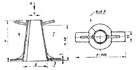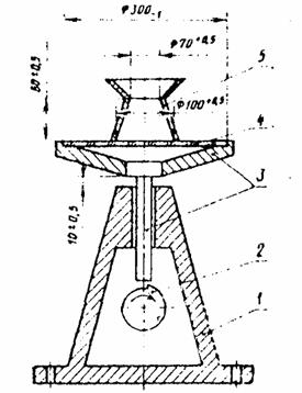 Требования к извести строительной приведены в ГОСТ 9179-77, а к веществам вяжущим известесодержащим гидравлическим - в ГОСТ 2544-76. 4. Методы испытаний и оценка качества материалов на минеральных вяжущихМестные минеральные вяжущие находят широкое применение в дорожном строительстве для укрепления грунтов, изготовлении различных смесей для устройства оснований дорожных одежд и других целей. В данном разделе приведены методы испытаний бетонных смесей на местных вяжущих и требования к бетону, укрепленным пористым каменным материалам и грунтам. Определение удобоукладываемости бетонной смеси Конус (рис. 6) устанавливают на гладкий металлический лист и заполняют его бетонной смесью через воронку тремя слоями. Каждый слой уплотняют металлическим стержнем 25 раз. В процессе уплотнения конус должен быть плотно прижат к листу, на котором он установлен. После уплотнения избыток смеси срезают вровень с краями конуса. Рис. 6. Конус для определения удобоукладываемости бетонной смеси: 1 - ручка; 2 - конус прибора; 3 - упоры; 4 - сварной шов Конус плавно в течение 3 - 7 с снимают с уплотненной смеси и ставят рядом с ней на лист. На верх металлического конуса кладут ребром линейку и замеряют расстояние от низа линейки до верха бетонной смеси. Осадку конуса характеризуют величиной этого расстояния в см. Осадку конуса бетонной смеси определяют дважды. Время от момента наполнения металлического конуса смесью до конца испытания должно быть не более 10 мин. Осадку конуса вычисляют как среднее арифметическое двух определений, отличающихся между собой не более чем: на 1 см при ОК равной или менее 4 см; на 2 см при ОК = 5 - 9 см; на 3 см при ОК равной или более 10 см. Определение жесткости бетонной смеси На виброплощадке устанавливают и жестко закрепляют цилиндрическое кольцо прибора. В это кольцо вставляют конус и закрепляют его ручками, затем устанавливают воронку. Конус заливают бетонной смесью, уплотняют ее и снимают конус так же, как при определении удобоукладываемости смеси. Поворачивая штатив, устанавливают диск над отформованной в виде конуса бетонной смесью и плавно опускают его на поверхность смеси. Штатив закрепляют во втулке зажимным винтом. Включают одновременно вибратор и секундомер и наблюдают за оплыванием бетонного конуса. Вибрирование производят до появления цементного теста из двух отверстий диска. В этот момент выключают секундомер и вибратор. Полученное время (в секундах) характеризует жесткость бетонной смеси. Жесткость бетонной смеси определяют дважды и вычисляют как среднее арифметическое результатов двух определений. Расхождение между двумя параллельными испытаниями не должно превышать 20 %. Определение раствороотделения бетонной смеси Бетонную смесь укладывают в металлическую стандартную форму в виде куба с размером ребра 200 мм и уплотняют. Затем уплотненную бетонную смесь вместе с формой укрепляют на виброплощадке и подвергают вибрированию в течение периода времени, равному 10Ж, где Ж - показатель жесткости бетонной смеси, с. Пластичные смеси вибрируют в форме в течение 25 с. После этого верхнюю половину смеси из формы кладут на один противень, а нижнюю - на другой. При испытании жестких бетонных смесей можно производить разделение распалубленного образца. Отобранные пробы бетонных смесей взвешивают с точностью до 10 г и подверга