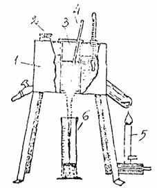 5. Методы испытаний и оценка качества сырья для производства нефтяных, вязких, дорожных битумовСырьём для производства нефтяных вязких дорожных битумов являются остатки после атмосферно-вакуумной перегонки высокосернистых, высокосмолистых нефтей типа арланской и сернистых смолистых типа западно-сибирских нефтей. При переработке западно-сибирских нефтей допускается получение сырья путём смешения гудрона с АВТ и асфальта деасфальтизации первой ступени. Определение условной вязкости Для определения условной вязкости сырья необходимы стандартный вискозиметр (рис. 7), секундомер, мерный цилиндр на 100 мл и фарфоровая чашка. В водяную баню вискозиметра заливают воду с температурой 82 - 83 °С. Сырьё с такой же температурой заливают в цилиндр до штифта на стержне. Диаметр сточного отверстия цилиндра должен быть равен 5 мм. Когда температура воды и сырья будет 80 °С, приподнимают стержень клапана и сырьё вытекает в мерный цилиндр, поставленный под отверстие цилиндра. Когда уровень сырья в мерном цилиндре достигнет отметки 25 мл включают секундомер, а когда уровень подойдёт к отметке 75 мл, его выключают. Время истечения 50 мл сырья через сточное отверстие 5 мм при температура 80 °С принимают за условную вязкость. Время истечения измеряют в секундах. За окончательный результат принимают среднее из двух определений, если расхождение между ними не превышает 10 %. Температуру вспышки определяют по ГОСТ 4333-48, содержание воды в сырье измеряют в соответствии с ГОСТ 2477-65, а плотность сырья - по ГОСТ 3900-85. Рис. 7. Стандартный визкозиметр: 1 - водяная баня; 2 - крышка; 3 - цилиндр; 4 - шариковый клапан; 5 - горелка; 6 - мерный цилиндр Сырьё для производства нефтяных вязких дорожных битумов должно соответствовать техническим условиям Министерства нефтеперерабатывающей и нефтехимической промышленности СССР, согласованным с Минавтодором РСФСР, ТУ 38 101582. Таблица 33 Требования к сырью по ТУ 38 101582