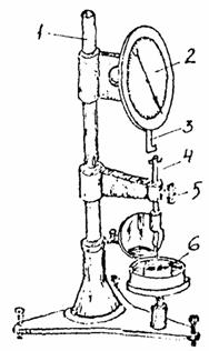 Рис. 8. Пенетрометр: 1 - опора; 2 - лимб; 3 - кремальера; 4 - стержень с грузом и иглой; 5 - стопорная кнопка; 6 - бюкс с битумом 6. Методы испытаний и оценка качества органических вяжущихОпределение глубины проникания иглы Глубина проникания иглы характеризует условную вязкость вяжущего, которая связана с такими свойствами как прочность пленки, температура размягчения и хрупкости и др. Для определения глубины проникания иглы в вяжущее необходимы пенетрометр (рис. 8), чашка металлическая цилиндрическая с плоским дном внутренним диаметром 55 ± 2 мм, водяной термостат, баня водяная вместимостью на менее 10 л и высотой не менее 200 мм, термометры ртутные стеклянные 0 - 50 °С и 0 - 360 °С, секундомер, сито с размером отверстий 0,63 мм, сосуд стеклянный плоскодонный емкостью 1 л, чашка, для расплавления вяжущего. Для проведения испытания вяжущий материал заливают в стандартную металлическую чашку, охлаждают на воздухе, а затем выдерживают при температуре испытания, например, 25 °С в течение часа, а затем помещает в плоскодонный сосуд с водой, имеющий температуру 25 ± 0,1 °С. Высота слоя воды над поверхностью вяжущего материала должна быть не менее 10 мм. Затем подводят острие иглы к поверхности вяжущего, доводят кремальеру до верхней площадки плунжера, несущего иглу и устанавливают стрелку прибора на 0. Включают секундомер и одновременно нажимают кнопку прибора и через 5 с отпускают ее. После этого доводят кремальеру до верхней площадки плунжера и отмечают показание прибора по шкале. Глубину проникания при 0 °С определяют по описанной методике со следующими изменениями: вяжущее охлаждают на воздухе в течение 1 - 1,5 ч. В баню наливают воду со льдом, ее температура должна быть 0 ± 0,1 °С. Вяжущее выдерживают при 0 °С в течение 1 - 1,5 ч. На плунжер прибора надевают дополнительный груз - шайбу массой 100 г. Время погружения иглы в вяжущее 60 с. За величину глубины проникания иглы принимают среднее арифметическое значение результатов не менее трех параллельных измерений. Допускаемые расхождения не должны превышать следующих величин: