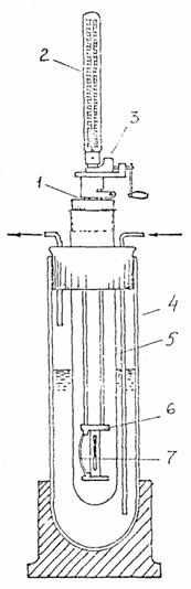 где V1 - объем 0,1 н раствора трилона Б, пошедшего на титрование СаО + MgO, мл; V2 - объем 0,1 н раствора трилона Б, пошедшего на титрование CaO, мл; TMgO - титр 0,1 н раствора трилона Б, выраженный в г MgO; m - масса извести, г; 5 - коэффициент, учитывающий определение MgO в аликвотной части раствора. Содержание активных окисей кальция и магния А определяется суммой величин А1 + А2. Определение тонкости помола минеральных вяжущих Тонкость помола вяжущих влияет на их физико-механические свойства, одним из которых является прочность при сжатии и изгибе. Для определения тонкости помола минерального вяжущего необходимо сито с сеткой № 008 и прибор дм механического просеивания. Вяжущее высушивают при 105 - 110 °С до постоянной массы. Навеску 50 г просеиваю через сито. Просеивание считают законченным, если при контрольном просеивании сквозь сито проходит не более 0,05 г вяжущего. Тонкость помола характеризуют остатком на сите в процентах к первоначальной массе просеиваемой пробы с точностью до 0,1 %. Определение тонкости помола вяжущего по удельной поверхности производит в соответствии с ГОСТ 310.2-76. Определение сроков схватывания минеральных вяжущих Сроки схватывания минеральных вяжущих являются технологическим параметром, определяющим время от момента изготовления смеси до ее уплотнения в конструкции. Для определения сроков схватывания используют прибор Вика с иглой и пестиком, кольцо к прибору Вика и мешалку для приготовления цементного теста. Сроки схватывания определяют на тесте нормальной густоты. Нормальной густотой теста, перемешанного в мешалке, считают такую консистенцию его, при которой пестик прибора Вика (рис. 3), погруженный в кольцо, заполненное тестом, не доходит на 5 - 7 мм до пластинки, на которое установлено кольцо. Перед началом испытания проверяют исправность прибора, чистоту поверхности и отсутствие искривлений иглы. Иглу доводят до соприкосновения с поверхностью цементного теста нормальной густоты, приготовленного и уложенного в кольцо. Иглу погружают в тесто каждые 10 мин, передвигая кольцо после каждого погружения для того, чтобы игла не попадала в прежнее место. После каждого погружения иглу вытирают. Началом схватывания теста считают время, прошедшее от начала затворения его до того момента, когда игла не доходит до пластинки на 1 - 2 мм. Концом схватывания теста считают время от начала затворения до момента, когда игла погружается в тесто не более чем на 1 - 2 мм. Рис. 3. Прибор Вика: 1 - стержень; 2 - обойма станины; 3 - стопорный винт; 4 - указатель; 5 - шкала; 6 - пестик; 7 - игла Определение равномерности изменения объема Вяжущее при затворении водой должно равномерно изменять свой объем, в противном случае, при неравномерности его изменения, в сооружении возникают большие внутренние напряжения, могущие привести к его растрескиванию. Для проведения испытания необходимы бачок для испытания кипячением и ванна с гидравлическим затвором (рис. 4). Готовят тесто нормальной густоты и из чего делают образцы в виде лепешек диаметром 7 - 8 см и толщиной в центре около 1 см. Образцы заглаживают смоченным водой ножом от наружных краев к центру до образования острых краев и гладкой закругленной поверхности. Приготовленные образцы хранят 24 часа с момента изготовления, а из медленно твердеющих вяжущих - 48 часов в ванне с гидравлическим затвором, затем помещаю