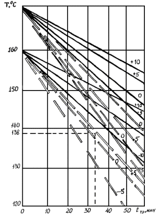 Примечание. В числителе - марка щебня по прочности, в знаменателе - по износу. Не допускается применение щебня (гравия) с содержанием пылевато-глинистых частиц более 3 %, а также щебня из глинистых (мергелистых) известняков, глинистых песчаников и глинистых сланцев. 2.3. Песок для приготовления асфальтобетонных смесей применяют в соответствии с ГОСТ 8736-85. Используются отсевы продуктов дробления горных пород и гравия, содержащих не более 5 % пылеватых глинистых частиц. Допускается применение песчано-гравийных смесей, отвечающих требованиям ГОСТ 23735-79. 2.4. Минеральный порошок, а также порошковые отходы промышленности (измельченные металлургические шлаки, золы-уноса ТЭС, пыль-уноса цементных заводов, порошковые отсевы камнедробления и др.) для приготовления асфальтобетонных смесей применяют согласно ГОСТ 16557-78 при условии соблюдения требований Руководства по применению порошкообразных отходов промышленности в качестве минерального порошка в асфальтобетонах 1 - 2 марки (Гипродорнии, М., 1988). 2.5. Битум для приготовления асфальтобетонных смесей применяют в соответствии с требованиями ГОСТ 22245-76 и ГОСТ 11955-82. Допускается использование комплексных органических вяжущих, физико-механические показатели которых отвечают требованиям указанных ГОСТов, включая битумодегтевые и дегтебитумные композиции, вяжущие, приготовленные с использованием каменноугольных смол, продуктов лесохимической промышленности и других компонентов. Каменноугольные дегти и смолы применяются в соответствии с Руководством по применению каменноугольных вяжущих в дорожном строительстве (Гипродорнии, М., 1979). Используются и нефтяные остаточные битумы в соответствии с требованиями Технических указаний по применению нефтяных гудронов (остаточных битумов в дорожном строительстве (Гипродорнии, 1975)). Выбор вида и марки органического вяжущего для приготовления асфальтобетонных, дегтебетонных и других типов смесей производят в зависимости от категории дороги и климатических условий района строительства с учетом Руководства по строительству дорожных асфальтобетонных покрытий. 2.6. Асфальтобетонные смеси по составу и физико-механическим характеристикам должны удовлетворять требованиям ГОСТ 9128-84. При использовании смеси двух видов щебня различной прочности асфальтобетонные смеси должны отвечать требованиям ТУ 218 РСФСР 541-85. Допускается применение высокопористых асфальтобетонных смесей с содержанием щебня более 65 % при условии устройства поверхностной обработки или замыкающего слоя из плотного асфальтобетона. 3. ТЕХНОЛОГИЯ УСТРОЙСТВА СЛОЕВ УВЕЛИЧЕННОЙ ТОЛЩИНЫ3.1. Транспортирование смесей 3.1.1. С целью уменьшения теплопотерь при транспортировании желательно применение автомобилей-самосвалов с повышенной грузоподъемностью (10 - 12 т). 3.1.2. Продолжительность транспортирования должна быть такой, чтобы смесь не успевала остыть ниже допустимой температуры. При этом необходимо учитывать, что органическое вяжущее является теплоизолятором для минеральной части. Поэтому чем меньше норма вяжущего, тем быстрее остывает смесь. 3.1.3. Расчет остывания смеси в период транспортирования может быть произведен по номограмме на рис. 3.1, где приведен ключ к пользованию номограммой. На горизонтальной оси отложено время транспортирования (в минутах). Цифры на кривых обозначают те