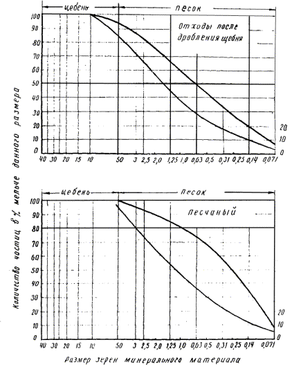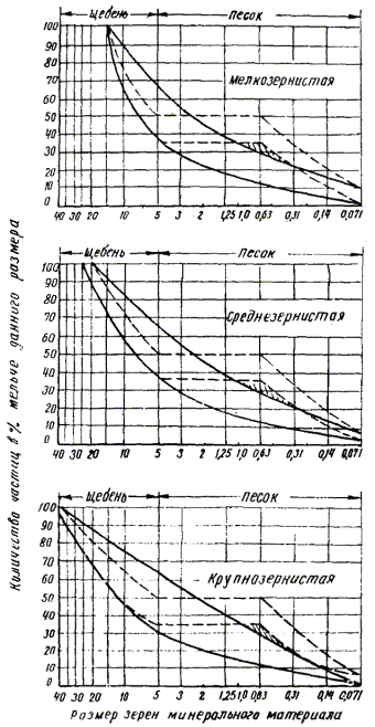 Прочность конструкций, удовлетворяющих требованию п. 7, на изгиб не проверяется. Общий модуль упругости слоев, подстилающих асфальтобетонное основание, должен быть не менее 400 кгс/см2. 12. В целях обеспечения надлежащей работы механизмов при укладке асфальтобетонной смеси по песчаному подстилающему слою, в конструкции дорожной одежды должен быть предусмотрен дополнительный подстилающий слой толщиной 8-12 см из крупнозернистых материалов (щебень, щебеночно- и гравийно-песчаные смеси и др.) или грунта, укрепленного цементом. Требования к смесям из высокопористого асфальтобетона13. Зерновой состав минеральной части асфальтобетонных смесей с уменьшенным содержанием битума должен соответствовать приведенному в табл. 3 и на рис. 2 и 3. Допускается в некоторых случаях при экономической целесообразности применять асфальтобетонные смеси, кривая зернового состава которых проходит через заштрихованную зону, указанную на рис. 2, если при этом обеспечивается нормированная пористость минерального остова. 14. Зерновой состав высокопористого асфальтобетона отличается от состава пористого асфальтобетона по ГОСТ 9128-76 обязательным наличием фракции мельче 0,071 мм (наиболее целесообразен высококачественный минеральный известняковый порошок), некоторым изменением содержания частиц крупнее 5 мм и дополнительно рекомендуемыми песчаными смесями для высокопористого песчаного асфальтобетона. 15. Применение смесей указанных зерновых составов позволяет получить высокопористый асфальтобетон каркасной структуры и требуемых свойств при уменьшенном расходе битума (в 1,5-2 раза по сравнению с ГОСТ 9128-76). Таблица 3