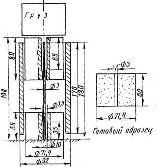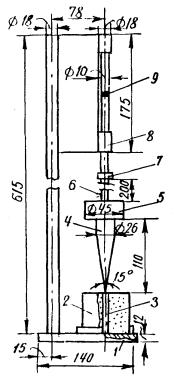 где g0 - объемный вес минерального остова асфальтобетона, г/см3; g - объемный вес асфальтобетона, г/см3; gу0 - средний удельный вес минерального остова асфальтобетона, г/см3; gуа - удельный вес асфальтобетона, г/см3. Приложение 3Методика определения условного показателя когезииЗа условный показатель когезии принимают количество ударов, необходимых для разрушения образца, уплотненного под нагрузкой 0,5 кгс/см2. В основу методики определения условного показателя когезии битума в асфальтобетонных смесях при уменьшенном его содержании положен метод, используемый для определения слеживаемости холодных асфальтобетонных смесей. Образцы диаметром 71,4 и высотой 60±1 мм готовят в цилиндрических формах (рис. 1). В отверстие в центре нижнего вкладыша высотой 50 мм вставляют стальной стержень диаметром 3 мм и длиной 180 мм. В центре верхнего вкладыша высотой 80 мм просверливают отверстие диаметром 3,5 мм. Перед уплотнением образца форму с вкладышами нагревают в термостате до температуры 80 - 90 °С. Температура смеси с уменьшенным содержанием битума должна быть 120 °С. Форму устанавливают на две подставки высотой 25 - 30 мм, а нижний вкладыш со стержнем опускают в форму. Навеску асфальтобетонной смеси засыпают в форму. Верхний вкладыш вводят в форму таким образом, чтобы стержень свободно вошел в его отверстие. Затем, поддерживая форму рукой, убирают нижние подставки, а на верхний вкладыш устанавливают груз, масса которого вместе с верхним вкладышем должна составлять 20 кг, что обеспечивает требуемую нагрузку 0,5·105 Па (0,5 кгс/см2). Под указанной нагрузкой асфальтобетонную смесь выдерживают в течение 3 мин, после чего груз снимают, форму поднимают, верхний вкладыш снимают с образца, а затем образец осторожно снимают со стержня и переносят к месту хранения, где выдерживают при температуре 18±2 °С в течение 30 мин. Если образец после уплотнения сразу рассыпается, то показатель условной когезии равен 0. Для испытания готовят три параллельных образца. После выдерживания образцов при температуре 18±2 °С в течение 30 мин их устанавливают на подставку прибора (рис. 2). Острие конуса прибора вводят в отверстие образца. Затем одной рукой слегка придерживают штангу прибора с навинченным на нее кожаным наконечником (чтобы острие конуса не выходило вверх из отверстия в образце), а другой поднимают цилиндрический груз массой 500 г, свободно перемещающийся по штанге, на высоту 20 см и опускают. Удары груза по конусу повторяют до тех пор, пока образец полностью не разрушится или острие конуса не коснется подставки прибора. Рис. 1. Форма для уплотнения образцов и готовый образец Рис. 2. Прибор для определения условного показателя когезии: 1 - основание с подставкой под образец; 2 - образец; 3 - отверстие в образце; 4 - конусный наконечник; 5 - груз массой 500 г; 6 - штанга (вес штанги с наконечником 500 г); 7 - упорное кольцо; 8 - направляющая втулка; 9 - риска на штанге В центре основания прибора имеется отверстие для предохранения острия конуса (угол в вершине конуса равен 15°) от затупления. Для фиксации момента касания острия конуса нижней подставки в верхней части штанги нанесена риска. Условный показатель когезии вычисляют как среднее арифметическое результатов испытания трех образцов. Расхождение между результатами испытания образцов из одного замеса не должно быть более 5 ударов. Указанный метод о