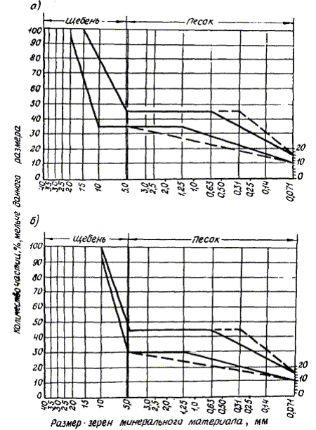 РЕКОМЕНДАЦИИ Утверждены зам. директора Союздорнии канд. техн. наук В. М. Юмашевым Одобрены Главдорстроем (письмо № 5603/191 от 14 марта 1986 г.) Москва 1986 МЕТОДИЧЕСКИЕ РЕКОМЕНДАЦИИ ПО УСТРОЙСТВУ ВЕРХНИХ СЛОЕВ ДОРОЖНЫХ ПОКРЫТИЙ ИЗ МНОГОЩЕБЕНИСТЫХ АСФАЛЬТОБЕТОНОВ С ПОВЫШЕННОЙ ПЛОТНОСТЬЮ. Союздорнии. М., 1986. Предложены составы многощебенистого асфальтобетона, отличающегося повышенными (по сравнению с требованиями ГОСТ 9128-84) плотностью, водо- и морозостойкостью. Повышенная плотность асфальтобетона обеспечивается прерывистым зерновым составом минеральной части и оптимальным соотношением между природным песком (с модулем крупности менее 2) и минеральным порошком, при котором минеральный остов имеет минимальную пористость. Приводятся требования к исходным материалам и показатели физико-механических свойств предлагаемого асфальтобетона. Излагаются особенности технологии устройства верхних слоев покрытий. Табл. 1, рис. 1. ПредисловиеВерхний слой асфальтобетонного покрытия в условиях современного движения должен обеспечивать требуемый коэффициент сцепления с колесом автомобиля, быть ровным и прочным, противостоять истирающему действию колес автомобильного транспорта. В I и во II дорожно-климатических зонах этот слой должен обладать высокой плотностью, водо- и морозостойкостью, а также водонепроницаемостью, что создает благоприятные условия для работы нижележащих слоев дорожной одежды. Наиболее высокими износостойкостью, долговечностью и работоспособностью отличаются покрытия из литых асфальтобетонов. Но внедрение этого материала в практику дорожного строительства затруднено ввиду необходимости использования для его приготовления, транспортирования и укладки специального оборудования. Недостатком покрытий из литых асфальтобетонов является также быстрая потеря шероховатости в результате погружения втапливаемого щебня в слой литого асфальтобетона или его выкрашивания, особенно в условиях тяжелого и интенсивного движения. В течение последних лет в Союздорнии и его Ленинградском филиале проведены исследования свойств многощебенистых асфальтобетонов с повышенной плотностью, которые по своей структуре и составу занимают промежуточное положение между литыми асфальтобетонами и асфальтобетонами по ГОСТ 9128-84. Высокие водо- и морозостойкость таких асфальтобетонов обусловлены повышенной плотностью минерального остова и низкой остаточной пористостью (менее 3 %). Экспериментальные работы, проведенные на объектах Главдорстроя и Минавтодора РСФСР, показали, что смеси предложенных составов технологичны, а устроенные из них верхние слои покрытий обладают повышенной плотностью, водонепроницаемостью, а также требуемым коэффициентом сцепления. По своей плотности такие слои сопоставимы с покрытиями из литого асфальтобетона, но выгодно отличаются от них тем, что для приготовления, транспортирования и укладки смеси не требуется специального оборудования. Экономический эффект от применения рассматриваемых асфальтобетонов за счет повышения долговечности покрытий составляет 1,13 тыс. руб. на 1 км покрытия. «Методические рекомендации» составили инж. А. П. Скрыльник, кандидаты технических наук Э. А. Казарновская (Союздорнии); И. П. Шульгинский (Ленинградский филиал Союздорнии). 1. Общие положения1.1. Настоящие «Методические ре