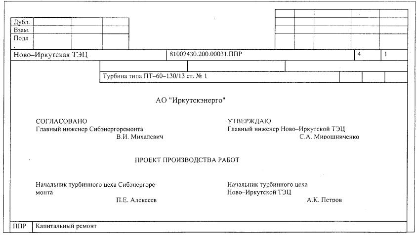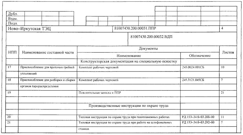 Дата введения 2003-03-01 Настоящие Методические указания устанавливают общие требования к разработке, составу, содержанию и оформлению проекта производства работ (ППР) для ремонта энергетического оборудования электростанций. Методические указания рекомендуются к применению акционерными обществами энергетики и электрификации, энергетическими и ремонтными предприятиями, а также всеми предприятиями (организациями), привлекаемыми для разработки ППР. 1 ОБЩИЕ ПОЛОЖЕНИЯ1.1 ППР состоит из комплекта технических и организационно-распорядительных документов, необходимых для подготовки и производства капитального или среднего ремонта, модернизации или технического перевооружения (далее в тексте - ремонт) оборудования энергопредприятий, в условиях безопасного выполнения работ. 1.2 ППР разрабатывается для ремонта основного и вспомогательного оборудования энергетических установок (котельной, турбинной, генераторной, трансформаторной, дизельной) и оборудования распределительных устройств, производимого на месте размещения в условиях существующей компоновки на электростанциях, котельных, подстанциях, ОРУ (энергопредприятиях) при наличии факторов, требующих обеспечения безопасного выполнения работ. 1.3 Основными производственными факторами в совокупности или в отдельности, определяющими необходимость разработки ППР, являются: - необходимость размещения составных частей оборудования, инвентарных устройств и организации временных рабочих мест ремонта за пределами площадок обслуживания ремонтируемой установки и размещения ремонтных площадок на отметках обслуживания находящегося в работе оборудования или других свободных площадках, не предназначенных согласно проектной документации энергопредприятия для использования при ремонте; - необходимость перемещения в процессе ремонта составных частей ремонтируемого оборудования и других крупногабаритных и тяжелых грузов посредством грузоподъемных кранов по трассам, проходящим над эксплуатируемым оборудованием энергопредприятия; - необходимость применения передвижных кранов для ремонта трансформаторов, высоковольтных выключателей в условиях действующих распредустройств; - необходимость в специальных проектных и конструкторских разработках на сооружение неинвентарных лесов, установку инвентарных лесов, временное закрепление конструкций, специальные грузоподъемные устройства и т.п. для обеспечения безопасного производства работ. 1.4 Исходными документами для разработки ППР являются: - годовой план ремонта оборудования энергоблоков и энергоустановок с укрупненным объемом работ по СО 34.04.181 (приложение 8); - технические условия на ремонт энергооборудования; - конструкторская документация на энергооборудование, подлежащее ремонту; - проектная документация энергопредприятия: планы и разрезы главного корпуса (сборочные чертежи), документы, входящие в раздел «Организация и механизация ремонта» технического (технорабочего) проекта. - СО 34.03.201 (РД 34.03.201); - СО 153-34.03.204 (РД 34.03.204); - ПОТ РМ-012-2000; - СО 153-34.03.150. 1.6 Перечень нормативных документов, на которые имеются ссылки в Методических указаниях, приведен в приложении А. 2 СОСТАВ КОМПЛЕКТА ДОКУМЕНТОВ ППР И ТРЕБОВАНИЯ К НИМ2.1 Состав комплекта документов ППР2.1.1 Комплект документов ППР включает: а) ведомость планируемых работ по ре