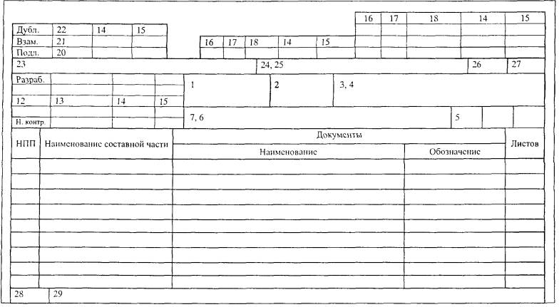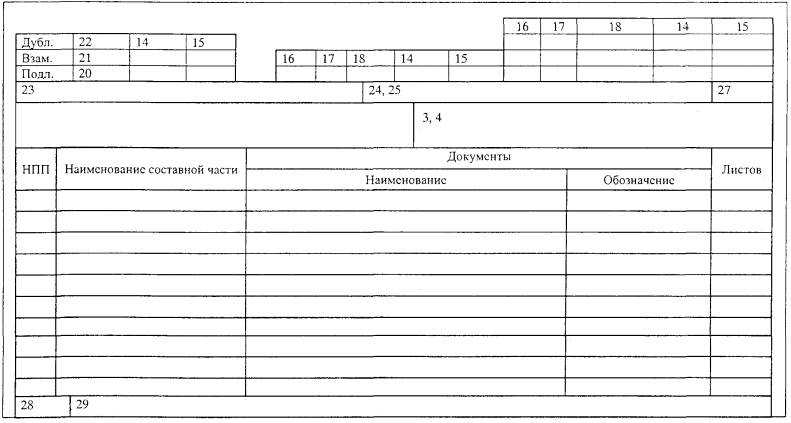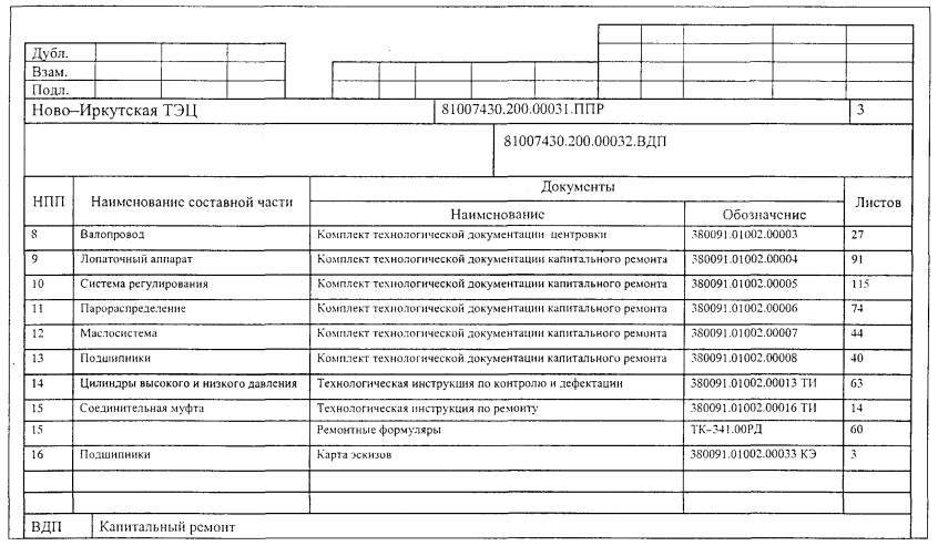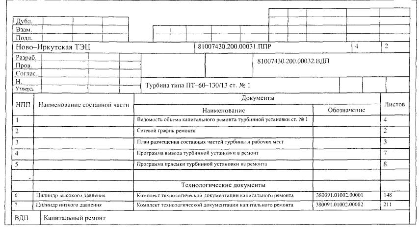4.3 Ведомость документов ППР4.3.1 ВДП предназначена для указания полного состава документов ППР. 4.3.2 ВДП разрабатывается на формах 5 и 5а по ГОСТ 3.1122 и в соответствии с приложениями Д и Е настоящего РД (заглавный лист и последующие листы). 4.3.3 Графы блоков основной надписи ВДП следует заполнять следующим образом: - графы 1, 2, 5, 6, 7, 16 - 18, 20 - 27, 29 - в соответствии с таблицей 1; - в графах 3, 4 указывается обозначение ВДП. Структура обозначения по приложению Г; - в графах 12 указываются характер работы, выполняемой подписывающими ВДП лицами, т.е. «Разработал», «Проверил», «Согласовал», «Утвердил», «Нормоконтроль» и др. - в графах 13, 14 и 15 указываются соответственно фамилии лиц, подписывающих ВДП, их подписи и дата подписи; - в графе 28 указывается обозначение вида документа - ВДП. 4.3.4 Документы ППР приводят в ВДП в последовательности, указанной в 2.1.1. Допускается после перечисления документов по 2.1.1 указывать производственные инструкции по охране труда, необходимые для безопасного производства работ, а также другие документы в соответствии с 2.1.4. 4.3.5 Пример оформления ВДП приведен в приложении Ж. 4.4 Ведомость планируемых работ по ремонту4.5 Сетевой график ремонта, план размещения составных частей оборудования и рабочих мест, проектная и конструкторская документация4.5.1 Документы, приведенные в 2.1.1 перечисление б, в, ж, з, и, к, разрабатываются на форматах по ГОСТ 2.301. 4.5.2 Формы, размеры и порядок заполнения основных надписей документов принимаются по ГОСТ 2.104. 4.6 Программа вывода энергоустановки в ремонт, программа приемки энергоустановки из ремонта, пояснительная записка4.6.1 Документы оформляются в соответствии с ГОСТ 2.106 (разделы 10 и 11). 4.7 Комплект технологических документов4.7.1 Комплект технологических документов разрабатывается и оформляется в соответствии с государственными стандартами ЕСТД. Приложение А(справочное) ПЕРЕЧЕНЬ НОРМАТИВНЫХ ДОКУМЕНТОВ, НА КОТОРЫЕ ИМЕЮТСЯ ССЫЛКИ