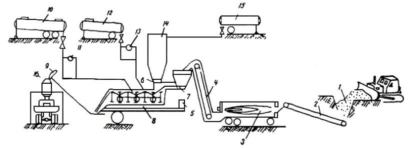 температуре 50 °С как отношение 16. ПАВ и полимеры вводят на поверхность минерального материала в виде водного раствора. 17. Образцы из горячих асфальтобетонных смесей, применяемых для устройства покрытий на дорогах III - IV категорий и верхних слоев оснований, должны отвечать требованиям табл. 1; для покрытий на дорогах V категории, верхних слоев оснований под облегченные покрытия и нижних слоев под все типы покрытий - требованиям табл. 2. Технология приготовления асфальтобетонных смесей18. Асфальтобетонные смеси на основе барханных песков приготавливают в стационарных смесительных установках на АБЗ либо в передвижных установках в притрассовых карьерах. При этом применяют битумы марок БНД 60/90 и БНД 40/60. 19. При выпуске смесей на стационарных АБЗ используют смесители любого типа (Д-508-2, Д-617-2, Д-645-3 и др.), а при выпуске смесей на передвижных установках - грунтосмесительные машины (ДС-50). 20. Технология приготовления смесей с применением барханного песка с местными заполнителями (молотые пески, зола уноса, цементная пыль) в асфальтосмесителях не отличается от технологии производства обычных асфальтобетонных смесей. 21. Барханный песок сушильного барабана после высушивания и нагрева горячим элеватором подают в бункер смесителя, сюда же в соответствующий отсек подают отдельным элеватором минеральный порошок. Из отсеков бункера песок и минеральный порошок после дозирования в весовых дозаторах попадают в мешалку для смешения с битумом. 22. При введении в смесь в качестве минерального порошка тонкомолотого барханного песка в технологическую схему включают шаровую мельницу. В процессе приготовления минерального порошка рекомендуется вводить на его поверхность поверхностно-активные добавки или активирующую смесь (смесь битума с ПАВ в соотношении 1:1), поэтому шаровую мельницу дополнительно снабжают рабочим узлом для подачи и дозирования ПАВ. Добавку или ее смесь с битумом вводят в шаровую мельницу вместе с просушенным минеральным материалом. Технологическая схема приготовления асфальтобетонной смеси на АБЗ приведена на рис. 1. 23. Для приготовления асфальтобетонных смесей в установке ДС-50 ее необходимо снабдить сушильными барабанами соответствующей производительности; обогреваемым элеватором для подачи песка от сушильного барабана в бункер смесительной установки; накопительным бункером и скиповыми подъемниками или же обогреваемым элеватором. Кроме того, установке придается автобитумовоз и автоцементовоз. Технологическая схема приготовления асфальтобетонной смеси в карьерной установке ДС-50 приведена на рис. 2. 24. При изготовлении асфальтобетонной смеси песок из карьера подается в бункер, из которого по транспортеру поступает в сушильный барабан, а затем через дозатор подается в смеситель. При необходимости в этот бункер подается также минеральный порошок. Затем материалы попадают в двухвальную лопастную мешалку непрерывного действия производительностью 100 т/час. Битум и ПАВ подают в мешалку из расходных емкостей. Готовую смесь складируют в бункере, из которого загружаются транспортные средства. 25. В качестве ПАВ для активации барханного песка следует применять госсиполовую смолу с Кокандского масло-жирового комбината, а для улучшения свойств смеси в нее добавляют катионные ПАВ Э-1 Э-4 и полимер ВРП-1, характеристика котор