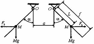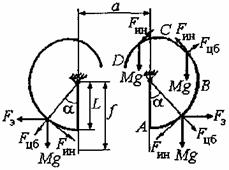 Рисунок 1 - Расчетная модель двух гибких проводников На рисунке 1 и далее приняты следующие обозначения: а - расстояние между осями проводников смежных фаз до КЗ, м; М - масса проводника расчетного пролета, кг; f - стрела провеса проводника в середине пролета, м; L - расстояние от прямой, соединяющей точки крепления проводника одного пролета, до центра масс этого проводника (длина маятника), м; a - угол отклонения проводника от вертикали, рад; Fэ - электродинамическая сила, Н; g - ускорение силы тяжести, м/с2. После отключения КЗ проводники сначала движутся по инерции, преодолевая действие силы тяжести и сохраняя при этом в течение некоторого времени, пока имеет место натягивающая проводники сила, форму, близкую к форме плоской гибкой нити, загруженной собственным весом. На этом этапе движения проводников их поведение уже менее точно описывается принятой расчетной моделью, хотя и здесь оценки их смещения оказываются приемлемыми. Тяжение в проводниках исчезает, когда центры масс проводников оказываются выше точек их крепления к опорам, и центробежные силы оказываются недостаточными для поддержания прежней формы проводников в виде гибкой натянутой нити. На этом этапе движения проводники подобны телам, падающим под действием инерционных сил и сил тяжести. Поэтому расчет смещений проводников с использованием модели в виде маятника здесь невозможен. При КЗ проводники под действием электродинамических сил отталкиваются друг от друга, а их максимальное сближение имеет место после отключения КЗ, при колебаниях проводников вокруг исходного положения равновесия. 3.1.3 Баланс сил в расчетных зонах При движении гибких проводников в результате возникшего на ВЛ или в РУ короткого замыкания расчетными нагрузками на расчетный маятник являются (рисунок 2):