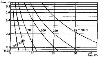 Рисунок 4 - Продолжительность КЗ, при которой р = 0,4 Если р > 0,4 кА2×с/Н, то сначала следует определить предельную продолжительность КЗ, с: