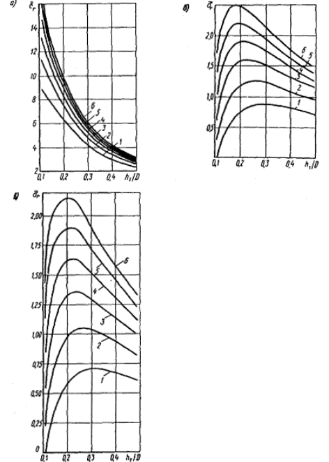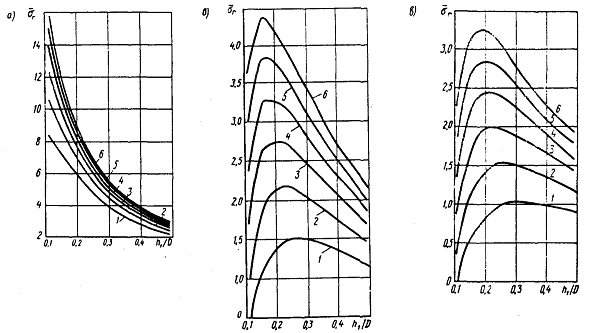 Рис. 2. Номограммы для определения растягивающих напряжений при изгибе в асфальтобетонном покрытии, расположенном на блочном основании из железобетона, бетона или материалов, укрепленных неорганическими вяжущими, с прочностью на сжатие более 15 МПа при устройстве трещинопрерывающего слоя из геосетки НПСП-Д с подгрунтовкой или эластичного ПБВ (а), из эластичного песчаного асфальтобетона (б), из щебня с полупропиткой или из плотной щебеночной смеси (в) при модуле упругости верхнего слоя 2000 МПа (1), 3000 МПа (2), 4000 МПа (3), 5000 МПа (4), 6000 МПа (5), 7000 МПа (6). Остальные обозначения - см. рис. 1
