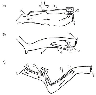 Рис. 3. Схемы использования вытянутых широких водоемов-охладителей (0,2 < B/L < 0,5): а - тип II.1; б - тип II.2; в - тип II.3; 1 - водовыпускное сооружение; 2 - водозаборное сооружение; 3 - плотина; 4 - отводящий канал; 5 - подводящий канал; 6 - струенаправляющее сооружение