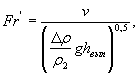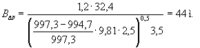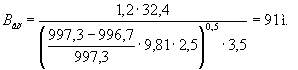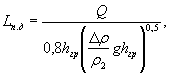 Перегрев на водозаборе определяется по номограмме, приведенной на рис. 6, δТ = 4,3 °С, откуда Тзаб = Тр + δТ = 19,8 + 4,3 = 24,1 °С; Твып = Тзаб + DТ = 24,1 + 9,0 = 33,1 °С. Среднеповерхностная температура водоема-охладителя Тs = Тзаб + ПТDТ = 24,1 + 0,25 · 9,0 = 26,4 °С. Определение геометрических параметров водовыпускного сооружения Из табл. I.2 приложения I определяются значения плотности воды, соответствующие температурам Твып, Тзаб и Тs, которые равны 994,7; 997,3 и 996,7 кг/м3 соответственно. По формуле (2.1) вычисляется параметр стратификации