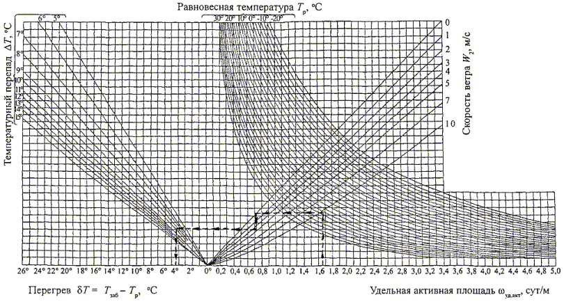 водоема-охладителя При расчете температурного режима для неустановившихся условий в формулу (3.15) вместо температуры Тр подставляется температура Те. Приближенная оценка температуры охлажденной циркуляционной воды может быть выполнена с использованием номограммы, приведенной на рис. 6. В этом случае после расчета активной площади водоема-охладителя по формуле (3.14) определяется соответствующая удельная площадь
