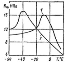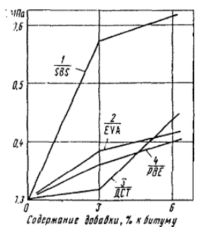 Сопротивление асфальтобетона сдвиговым деформациям в покрытии обычно рассматривают в виде суммы двух составляющих, обусловленных внутренним трением и сцеплением материала. Первая составляющая определяется зерновым составом смеси и не зависит от температуры и времени нагружения асфальтобетона. Показатель сцепления асфальтобетона (активная составляющая сопротивления сдвигу) зависит от температуры и времени нагружения и в основном определяется вязкостью асфальтового вяжущего. Поэтому при введении полимерных добавок в смесь показатель сцепления асфальтобетона повышается (рис. 1).