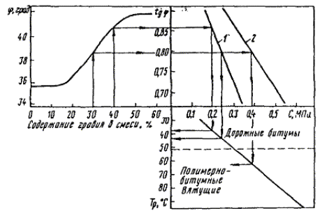 При исследовании сдвигоустойчивости песчано-гравийных асфальтобетонов была установлена зависимость показателя внутреннего трения tg φ от содержания гравия в случае неизменности растворной части смеси, выполняющей роль матрицы грубодисперсного материала. Эта зависимость имеет S-образный вид и характеризует увеличение внутреннего трения асфальтобетона по мере наполнения его гравием в диапазоне от 18 до 53 % от массы смеси.