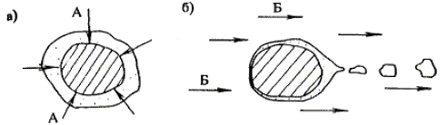 а - в статических условиях; б - при значительной относительной скорости частицы и растворителя; А - направление диффузии растворителя к поверхности частицы; Б - направление потока растворителя относительно частицы