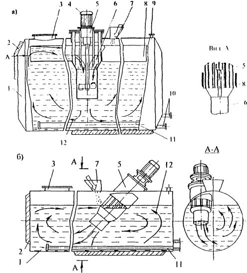 Для новых емкостей рекомендуется использовать систему с горизонтальным открытым с торцов корытообразным лотком (рисунок, а), простирающимся почти на всю длину емкости. При работе насоса-смесителя из обоймы вниз выбрасывается струя жидкости, а ее уровень в месте забора в лотке уменьшается. Разница уровней жидкости в середине и на концах лотка является движущей силой для ее поступления. Таким образом, в емкости образуется внутренняя циркуляция с расходом через насос-смеситель около 2000 м3/ч, причем вся жидкость в емкости вынужденно вовлекается в циркуляцию.