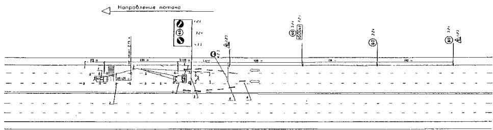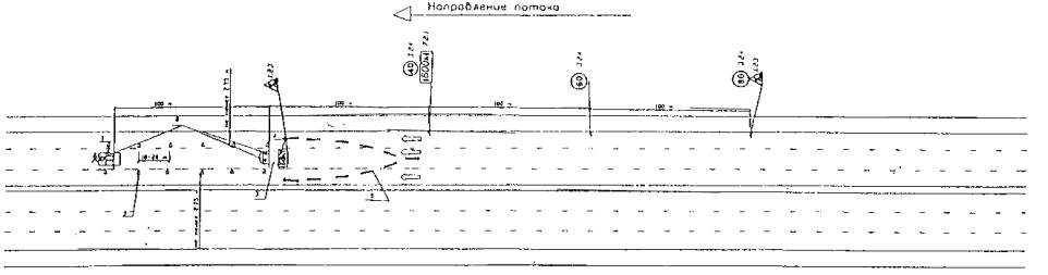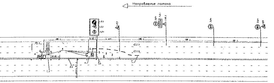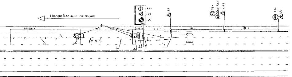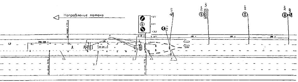 Рис. 8. Нанесение линий рядности по существующей разметке (обновление) 1 - предварительная разметка; 2 - сигнальные фишки (конуса) со светоотражающей поверхностью; 3 - машина прикрытия; 4 - импульсная стрелка (d 900; 1200); 5 - направление объезда транспорта; 6 - сигнальный фонарь. Примечания: 1). Дорожные знаки на стойках следует располагать на высоте не менее 2 м; дорожные знаки на временном ограждении следует располагать на высоте не менее 0,6 м. 2). Дорожные знаки 3.24 поэтапно (с шагом 20 км/час) ограничения скорости устанавливают последовательно на расстоянии 100 м друг от друга. 3). При производстве разметочных работ на основной проезжей части МКАД ограничение максимальной скорости на участке разметки устанавливают не ниже 60 км/час. 4). Зона действия знака 7.2.1 определяется длиной участка разметки. 5). Протяженность зоны изменения направления движения Lomz определяется с учетом скорости на подходе (Lomz =50 м при скорости до 40 км/час; Lomz =75 м при скорости до 60 км/час для перекрываемой проезжей части шириной 4 м). 6). Подрядная организация информирует службу ГИБДД о начале работ. 7). Работы проводятся только при наличии технических средств регулирования дорожного движения и схемы разметки, согласованной с ГИБДД. Приложение 2.9