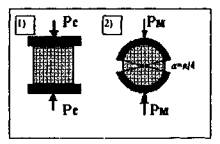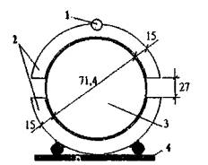 Рисунок 1 Испытательная машина с электромеханическим приводом (пресс) по ГОСТ 28840-90, обеспечивающая скорость деформирования образцов 50 мм/мин и диапазон нагрузок от 0 до 20 (50) кН. Индикатор перемещений по ГОСТ 577-68 (СТ СЭВ 3138-81, обеспечивающий измерение предельной деформации образцов при сжатии с точностью не менее 0,01 мм. Секундомер. Разрушающее устройство в виде двух одинаковых частей металлической трубы с внутренним радиусом равным половине диаметра образца. Термометр стеклянный с ценой деления шкалы 1 °С по ГОСТ 28498-90. Сосуд для термостатирования образцов вместимостью 7-8 л. Термостатирующее устройство, поддерживающее температуру воды 50±1 °С. Для испытания асфальтобетона на сдвигоустойчивость готовят четное число образцов в количестве не менее 6 штук. Высота образцов должна быть равной их диаметру в пределах допустимого отклонения не превышающего ± 1,5 мм. Перед испытанием образцы выдерживают в течение 1 ч. при заданной температуре (50±1 °С) в воде. Половина образцов предназначается для испытания на одноосное сжатие по первой схеме нагружения, другая половина - по второй схеме (рис.1). Разрушающие устройства перед испытанием асфальтобетонных образцов рекомендуется также нагревать до температуры 50±10 °С. Образцы, перед тем как поместить их в разрушающее устройство и на плиту пресса, вытирают мягкой тканью или фильтровальной бумагой. Максимальные разрушающие нагрузки и соответствующие предельные деформации асфальтобетонных образцов определяют с помощью испытательных машин с механическим приводом при двух схемах нагружения: при одноосном сжатии и при сжатии по схеме Маршалла. Скорость деформирования образцов для обоих схем нагружения следует принимать одинаковой и равной 50±0,5 мм/мин. Образец 3, извлеченный из водяной бани, устанавливают в центре нижней плиты пресса 4 при первой схеме нагружения (рис. 2) или в нижнее разрушающее устройство 2 при второй схеме нагружения (рис. 3).