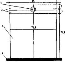 Рисунок 3 Для уменьшения потерь тепла и исключения склеиваимости образцов с соприкасающимися металлическими поверхностями рекомендуется между ними прокладывать один слой писчей бумаги. С целью повышения точности испытания рекомендуется применять шарнирные приспособления, состоящие из шарика 1 закрепленного в центре верхнего разрушающего устройства 2 (рис. 2 и 3). Шарнирные приспособления обеспечивают равномерное распределение нагрузки по нагружаемой поверхности асфальтобетонных образцов. При установке верхнего разрушающего устройства на образец в соответствии с рис. 3 рекомендуется использовать шаблонные прокладки толщиной 27 мм, обеспечивающие симметричность размещения верхней и нижней частей устройства по отношению к образцу. Перед началом испытания шаблонные прокладки вынимаются, чтобы не препятствовать деформированию образца. Верхняя плита пресса должна находиться на расстоянии 5-10 мм от верхнего разрушающего устройства. После этого включают электродвигатель пресса и начинают нагружать образец. В процессе испытания образца фиксируют максимальное показание силоизмерителя, которое принимают за разрушающую нагрузку. Одновременно с помощью индикатора перемещений замеряют предельную деформацию, соответствующую разрушающей нагрузке, и время нагружения образца по секундомеру. Допускается определять предельную деформацию по произведению постоянной скорости деформирования и времени нагружения образца. Для каждого образца, испытанного как на одноосное сжатие, так и по схеме Маршалла, вычисляют затраченную на разрушение работу по формуле