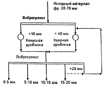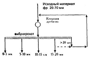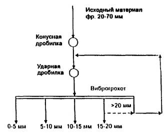 4.4. Содержание зерен слабых пород. Содержание в щебне зерен слабых пород не должно превышать 5 % (ГОСТ 8267). 4.5. Содержание пылевидных и глинистых частиц. Содержание в щебне пылевидных и глинистых частиц (мельче 0,05 мм) не должно превышать 1 % (ГОСТ 8267). 4.6. Морозостойкость. Морозостойкость щебня, характеризуемая количеством циклов замораживания-оттаивания, для асфальтобетона должна быть не менее F 50; при этом потеря массы при испытаниях не должна превышать 5 % (ГОСТ 8267). 4.7. Радиационно-гигиеническая оценка. Щебень в зависимости от суммарной удельной эффективной активности естественных радионуклидов Аэфф применяют: · для дорожного строительства в пределах населенных пунктов и зон перспективной застройки Аэфф до 740 Бк/кг; · вне населенных пунктов при Аэфф больше 740 до 2800 Бк/кг. 5. Технология получения5.1. Для производства щебня узких фракций кубовидной формы в качестве исходного материала необходимо использовать щебень фракций 20-70, 40-70 или 20-40 мм из изверженных (магматических) горных пород (гранит, габбро, габбро-диабаз и др.). Предпочтение следует отдавать щебню фракции 20-10 мм, который в процессе переработки дает меньшее количество отсевов дробления (фракции 0-5 мм). Количество и номинальный размер фракций щебня, содержание зерен пластинчатой (лещадной) и игловатой форм в готовой продукции устанавливаются по договору между потребителем и изготовителем. 5.2. Производство щебня узких фракций кубовидной формы осуществляется на специальных дробильно-сортировочных установках. Комплектация установок зависит от вида и крупности исходной горной породы, количества и номинального размера фракций щебня к готовой продукции, содержания зерен пластинчатой (лещадной) и игловатой форм в готовой продукции, а также требуемой производительности (приложения Б, В). Проектирование дробильно-сортировочных установок осуществляется в соответствии с нормами ОНТП-85. 5.3. Качество готовой продукции должно быть гарантировано договором (контрактом), заключенным производителем и поставщиком (фирмой) дробильно-сортировочного оборудования. Поставщиками дробильно-сортировочного оборудования должны быть специализированные отечественные и зарубежные фирмы. 5.4. В зависимости от количества в готовой продукции зерен пластинчатой (лещадной) и игловатой форм могут быть рекомендованы технологические схемы переработки, приведенные ниже. 5.5. При содержании зерен пластинчатой (лещадной) и игловатой форм до 15 % технологическая схема дробильно-сортировочной установки (рис. 1) состоит из приемного бункера с питателем, специальной конусной дробилки, работающей в замкнутом цикле с виброгрохотом. 5.6. При содержании зерен пластинчатой (лещадной) и игловатой форм до 10-12 % дробильно-сортировочная установка (рис. 2) включает приемный бункер-питатель, две параллельно работающие дробилки (специальная конусная и ударного действия) и виброгрохот. 5.7. Если содержание зерен пластинчатой (лещадной) и игловатой форм в готовой продукции требуется уменьшить до 5-7 %, то можно рекомендовать схему (рис. 3), включающую две последовательно работающие дробилки (специальную конусную и ударного действия). 6. Правила приемки и контроля6.1. Готовый щебень должен быть принят органами технического контроля предприятия-изготовителя по ГОСТ 8267 и настоящему стандарту. 6.2. Испытание исходного материала и гото
