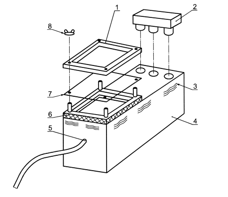 1 - удерживающая рама; 2 - проверяемая наборная или одиночная вентиляционная система; 3 - уровень воды; 4 - емкость из оргстекла или подобного материала; 5 - отверстие для ввода газа; 6 - резиновая прокладка; 7 - полиэтиленовая пленка; 8 - барашек (обязательно четыре винта) Рисунок 1 - Испытательное приспособление 4.2.3. Вся система в целом должна быть проверена на герметичность, кроме проверяемой вентиляционной системы, например с помощью мыльного раствора, пока заряжается батарея, используемая как источник газа.
